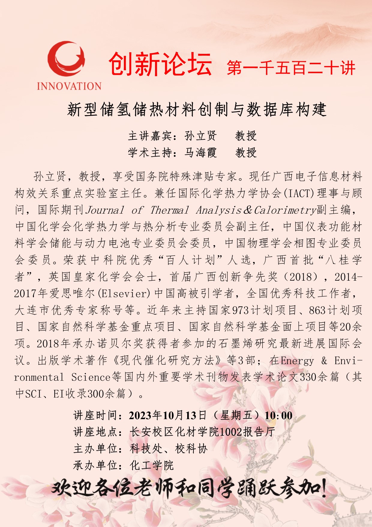孙立贤 教授 广发体育创新论坛第一千五百二十讲:新型储氢储热材料创制与数据库构建 讲座时间 2023年10月13日(星期五)10:00 讲座地点 长安校区化材学院1002报告厅 讲座人介绍 孙立贤 教授 讲座内容