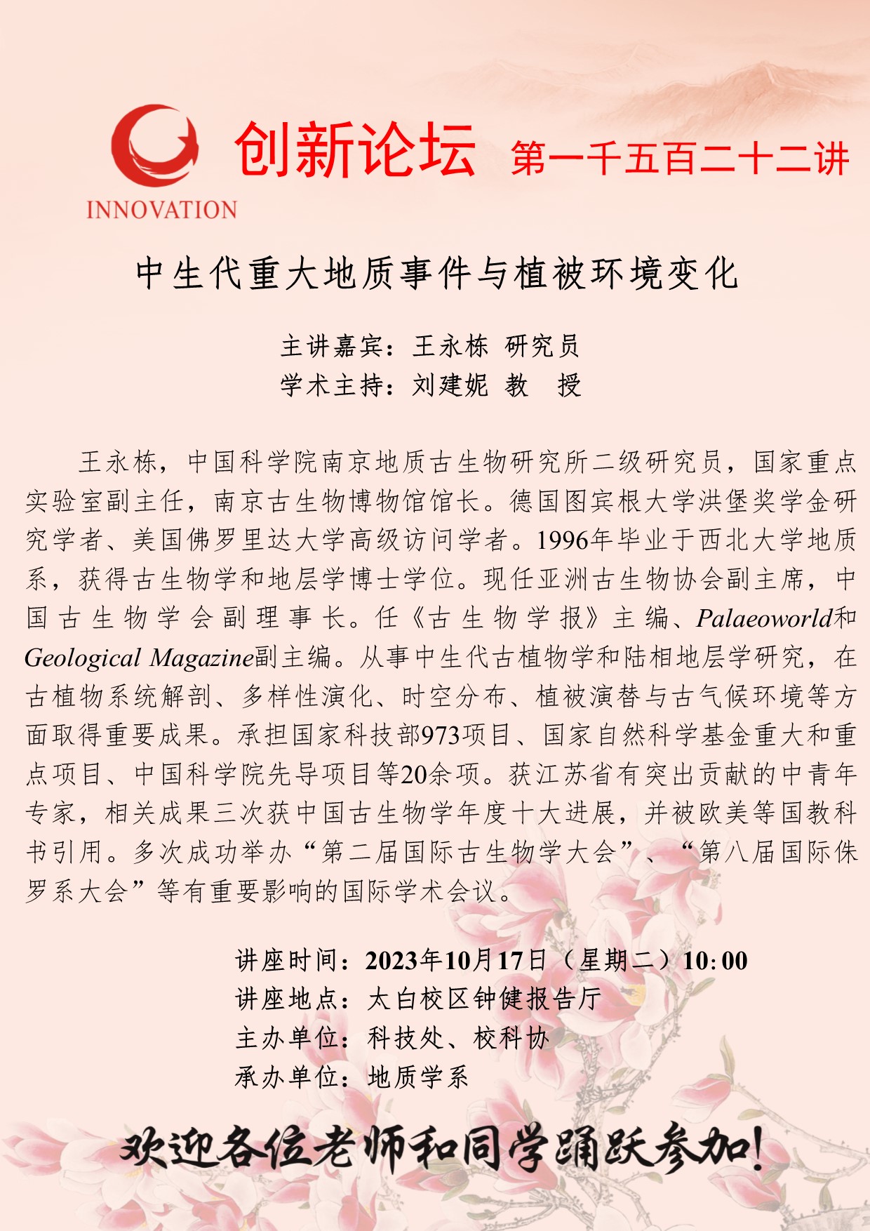 王永栋 研究员 广发体育创新论坛第一千五百二十二讲:中生代重大地质事件与植被环境变化 讲座时间 2023年10月17日(星期二)10:00 讲座地点 太白校区钟健报告厅 讲座人介绍 王永栋 研究员 讲座内容