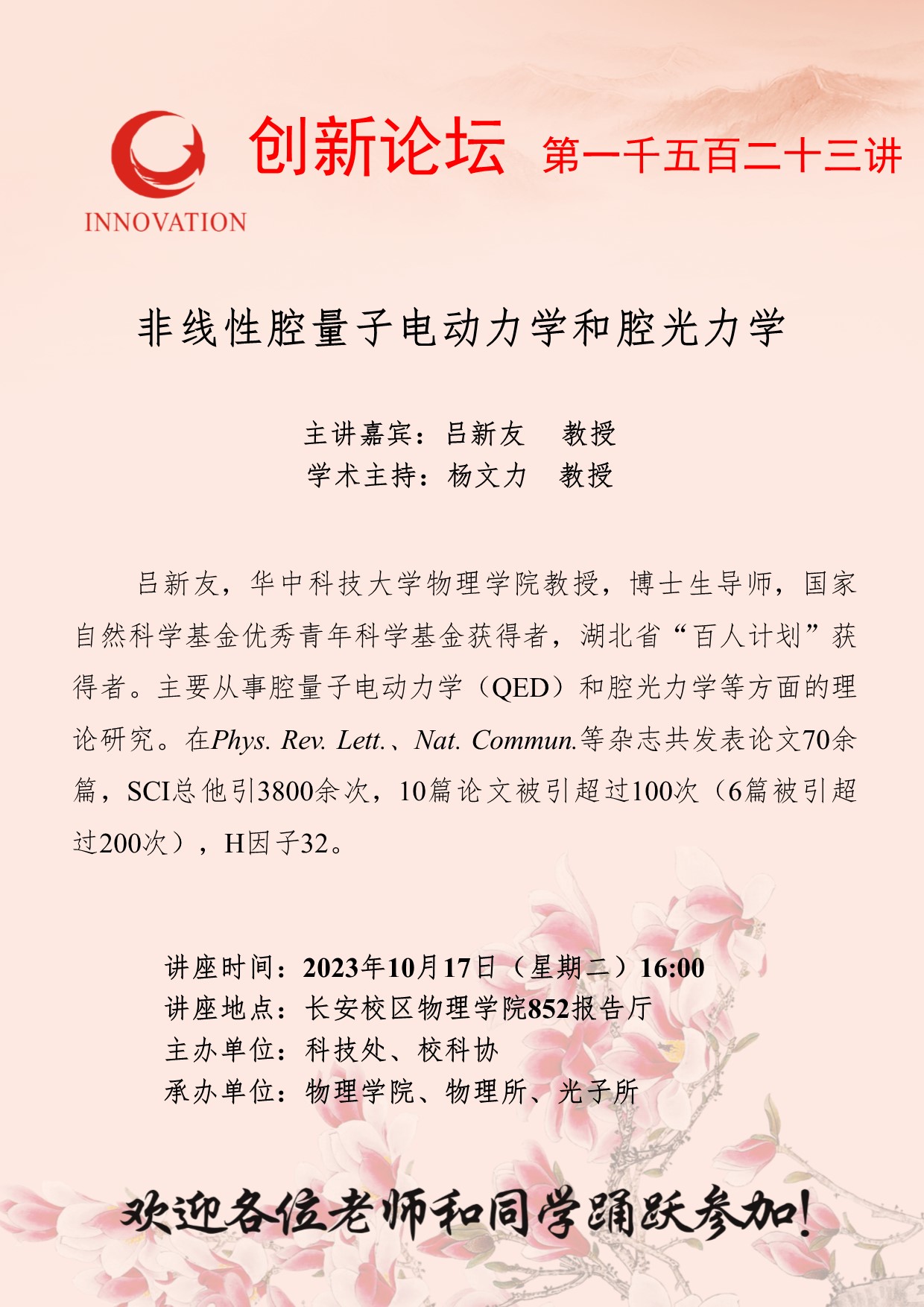 吕新友 教授 广发体育创新论坛第一千五百二十三讲:非线性腔量子电动力学和腔光力学 讲座时间 2023年10月17日(星期二)16:00 讲座地点 长安校区物理学院852报告厅 讲座人介绍 吕新友 教授 讲座内容