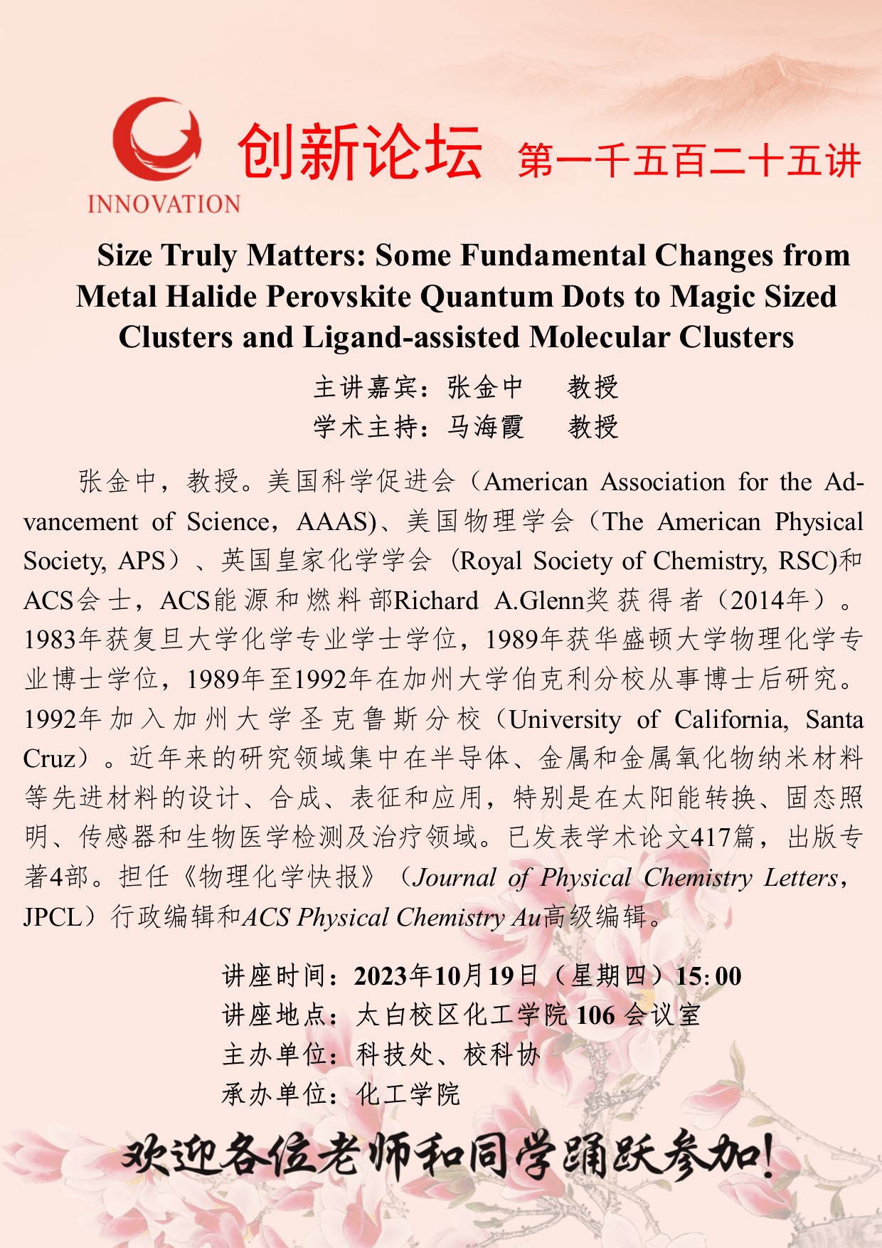 张金中 教授 广发体育创新论坛第一千五百二十五讲:Size Truly Matters: Some Fundamental Changes from Metal Halide Perovskite Quantum Dots to Magic Sized Clusters and Ligand-assisted Molecular Clusters 讲座时间 2023年10月19日(星期四)15:00 讲座地点 太白校区化工学院106会议室 讲座人介绍 张金中 教授 讲座内容