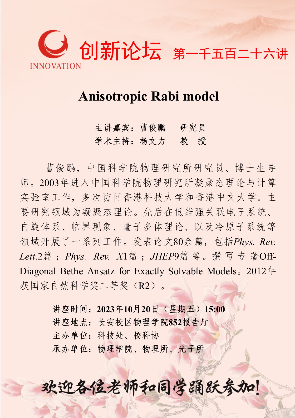 曹俊鹏 研究员 广发体育创新论坛第一千五百二十六讲:Anisotropic Rabi model 讲座时间 2023年10月20日(星期五)15:00 讲座地点 长安校区物理学院852报告厅 讲座人介绍 曹俊鹏 研究员 讲座内容