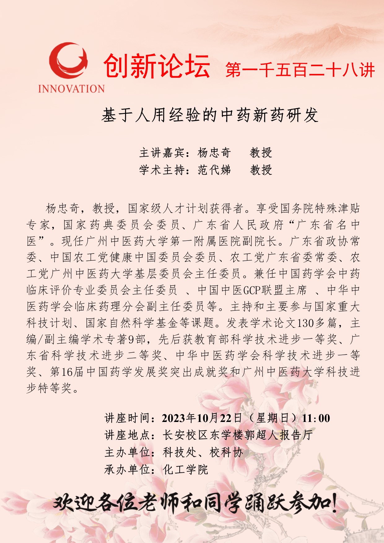 杨忠奇 教授 广发体育创新论坛第一千五百二十八讲:基于人用经验的中药新药研发 讲座时间 2023年10月22日(星期日)11:00 讲座地点 长安校区东学楼郭超人报告厅 讲座人介绍 杨忠奇 教授 讲座内容