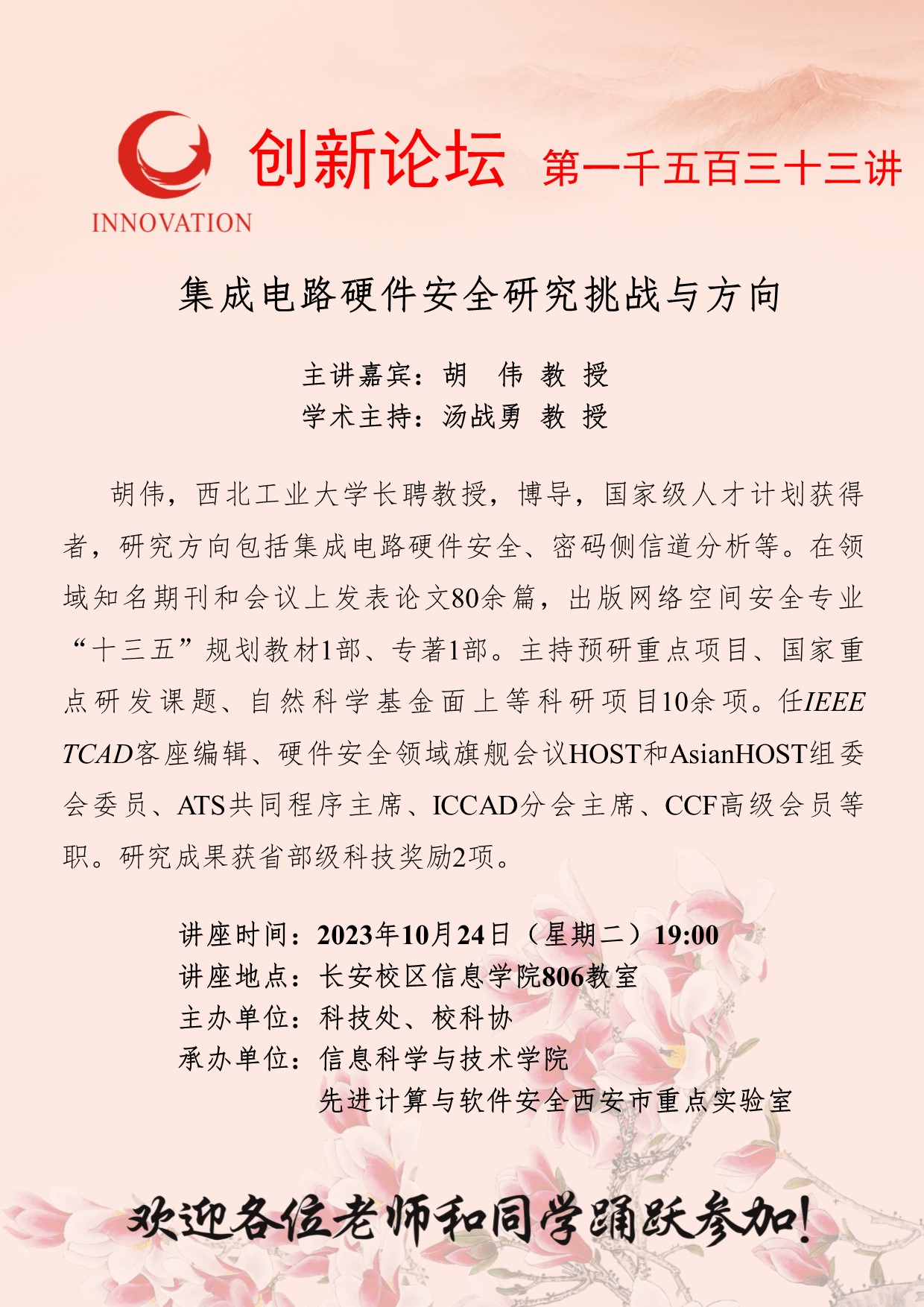 胡 伟 教授 广发体育创新论坛第一千五百三十三讲:集成电路硬件安全研究挑战与方向 讲座时间 2023年10月24日(星期二)19:00 讲座地点 长安校区信息学院806教室 讲座人介绍 胡 伟 教授 讲座内容