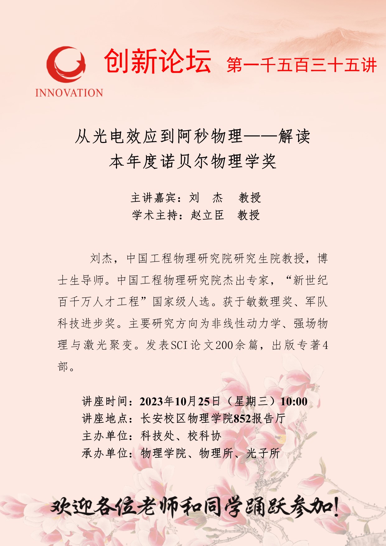 刘 杰 教授 广发体育创新论坛第一千五百三十五讲:从光电效应到阿秒物理——解读 本年度诺贝尔物理学奖 讲座时间 2023年10月25日(星期三)10:00 讲座地点 长安校区物理学院852报告厅 讲座人介绍 刘 杰 教授 讲座内容