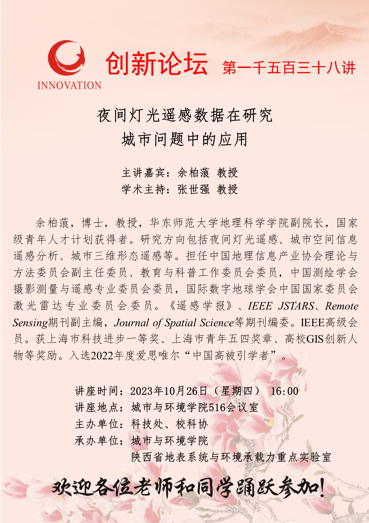 余柏蒗 教授 广发体育创新论坛第一千五百三十八讲:夜间灯光遥感数据在研究城市问题中的应用 讲座时间 2023年10月26日(星期四) 16:00 讲座地点 城市与环境学院516会议室 讲座人介绍 余柏蒗 教授 讲座内容