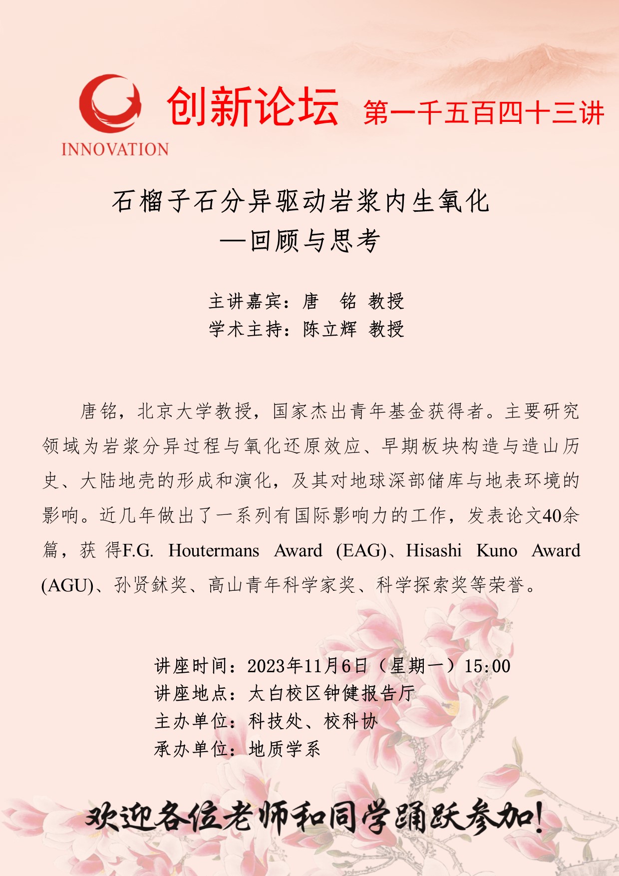 唐铭 教授 广发体育创新论坛第一千五百四十三讲:石榴子石分异驱动岩浆内生氧化—回顾与思考 讲座时间 2023年11月6日(星期一)15:00 讲座地点 太白校区钟健报告厅 讲座人介绍 唐铭 教授 讲座内容