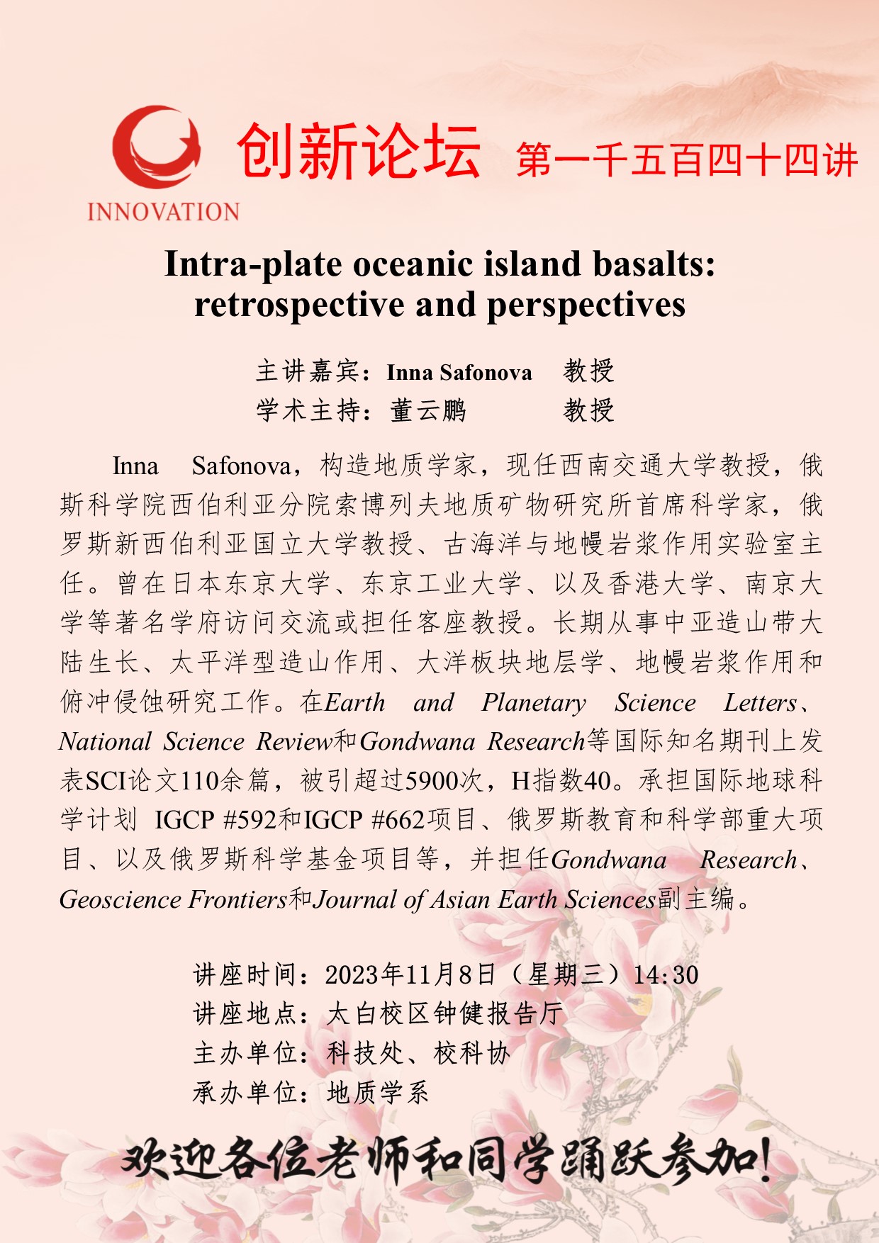 Inna Safonova 教授 广发体育创新论坛第一千五百四十四讲:Intra-plate oceanic island basalts: retrospective and perspectives 讲座时间 2023年11月8日(星期三)14:30 讲座地点 太白校区钟健报告厅 讲座人介绍 Inna Safonova 教授 讲座内容