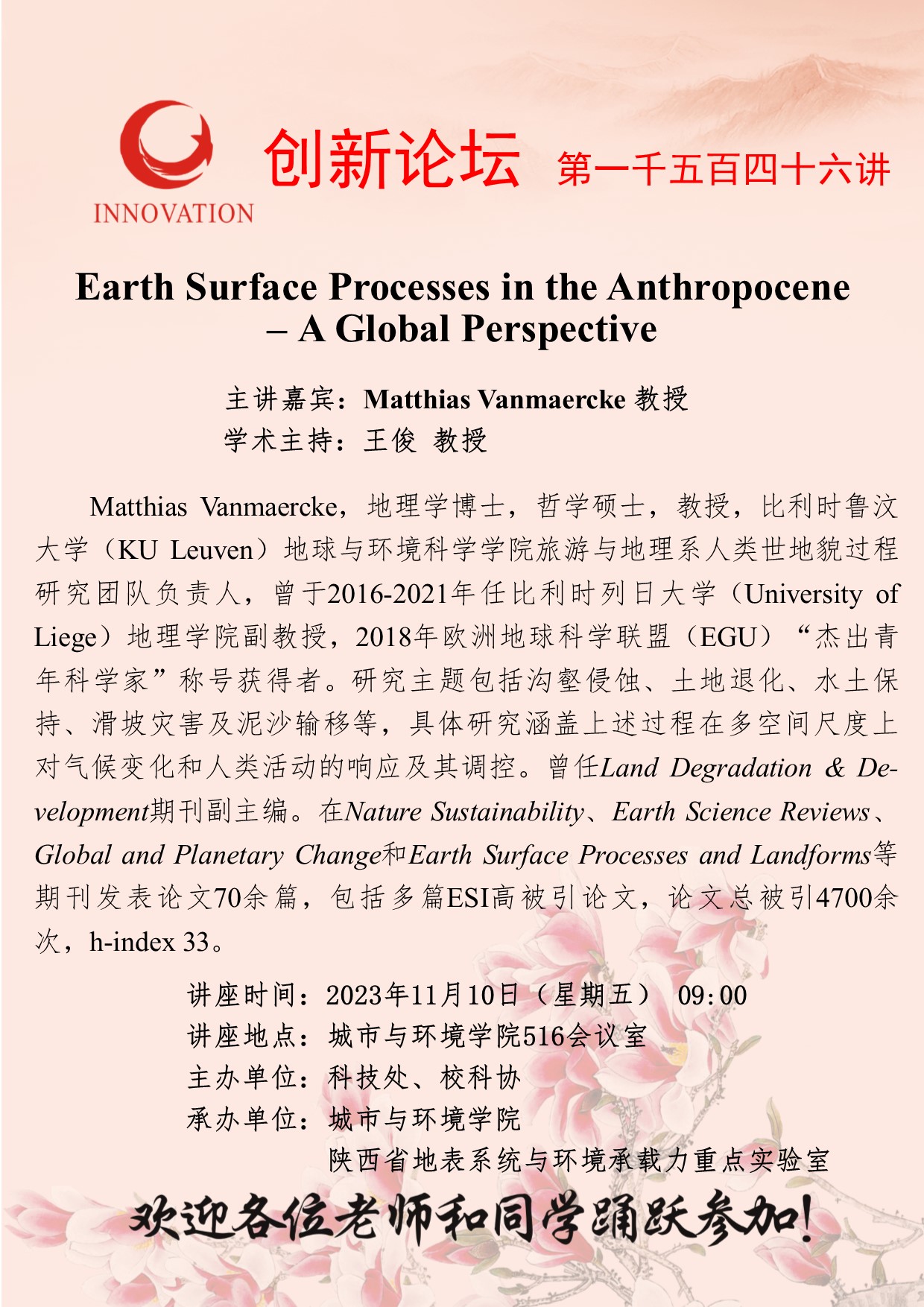 Matthias Vanmaercke 教授 广发体育创新论坛第一千五百四十六讲:Earth Surface Processes in the Anthropocene – A Global Perspective 讲座时间 2023年11月10日(星期五) 09:00 讲座地点 城市与环境学院516会议室 讲座人介绍 Matthias Vanmaercke 教授 讲座内容