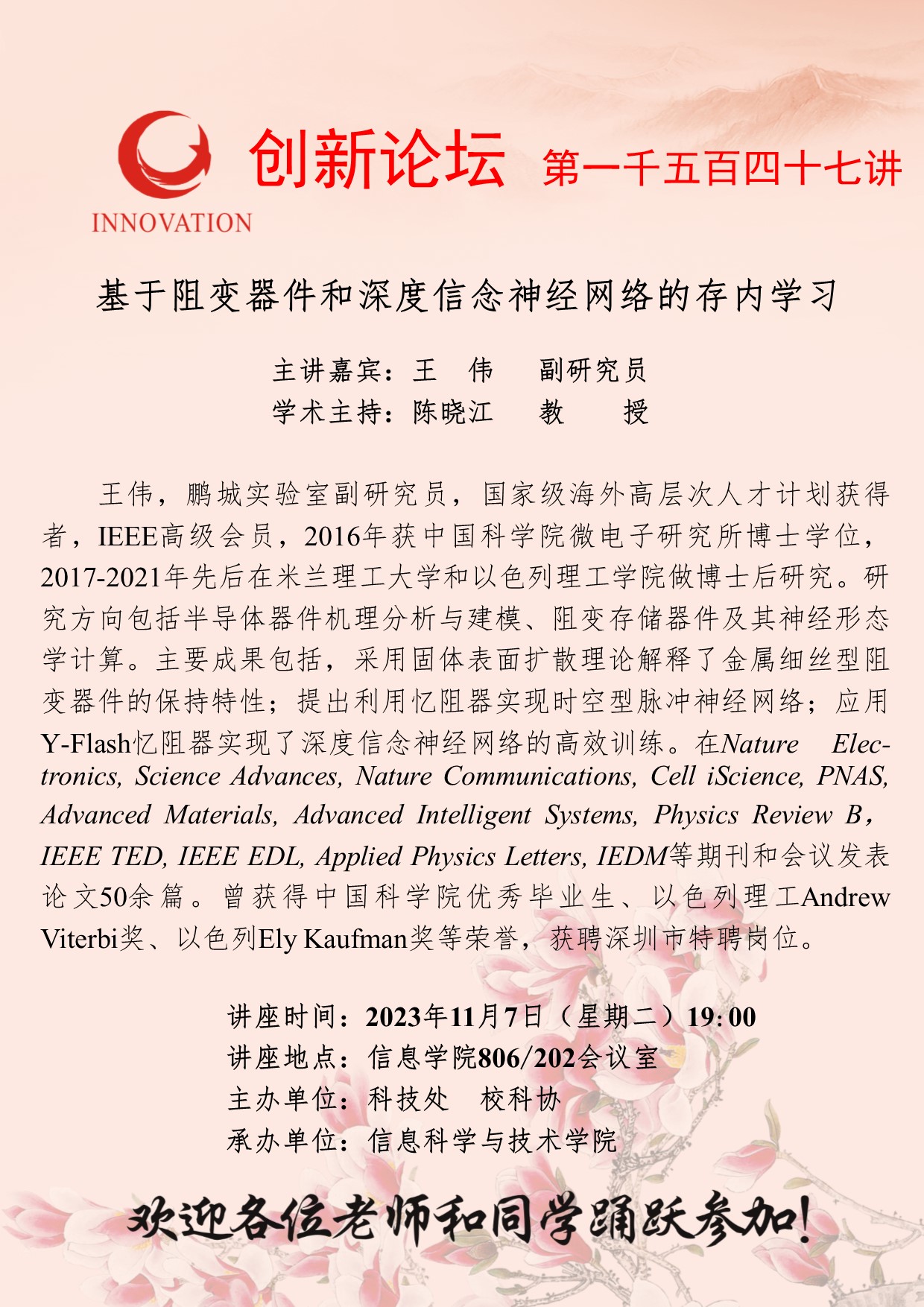 王 伟 副研究员 广发体育创新论坛第一千五百四十七讲:基于阻变器件和深度信念神经网络的存内学习 讲座时间 2023年11月7日(星期二)19:00 讲座地点 信息学院806/202会议室 讲座人介绍 王 伟 副研究员 讲座内容