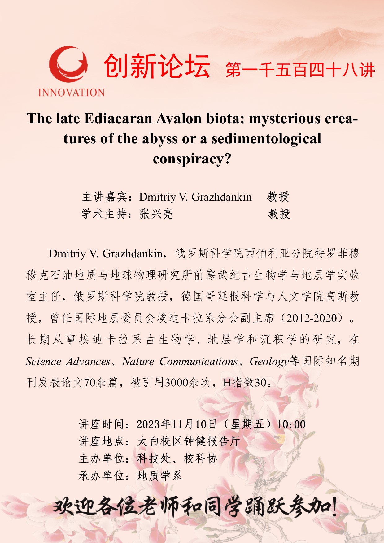 Dmitriy V. Grazhdankin 教授 广发体育创新论坛第一千五百四十八讲:The late Ediacaran Avalon biota: mysterious creatures of the abyss or a sedimentological conspiracy? 讲座时间 2023年11月10日(星期五)10:00 讲座地点 太白校区钟健报告厅 讲座人介绍 Dmitriy V. Grazhdankin 教授 讲座内容
