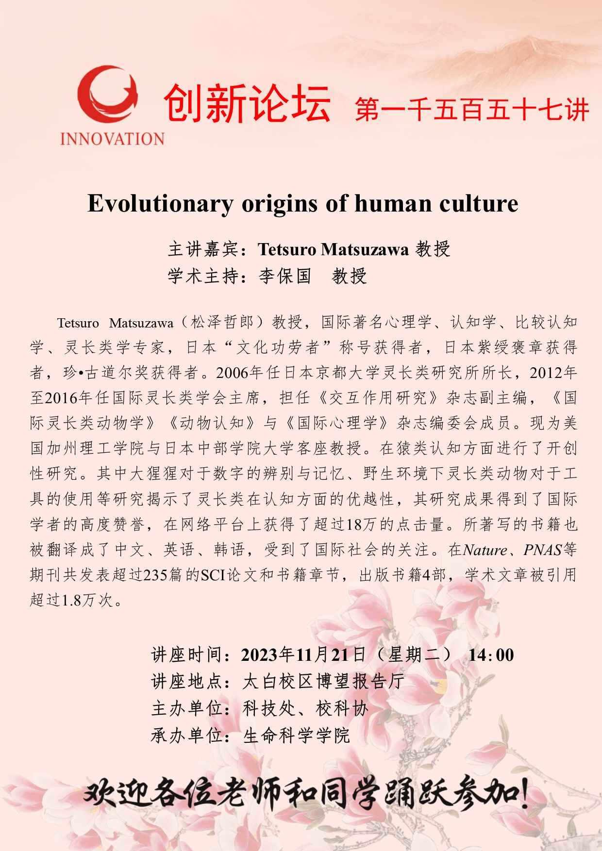 Tetsuro Matsuzawa 教授 广发体育创新论坛第一千五百五十七讲:Evolutionary origins of human culture 讲座时间 2023年11月21日(星期二) 14:00 讲座地点 太白校区博望报告厅 讲座人介绍 Tetsuro Matsuzawa 教授 讲座内容
