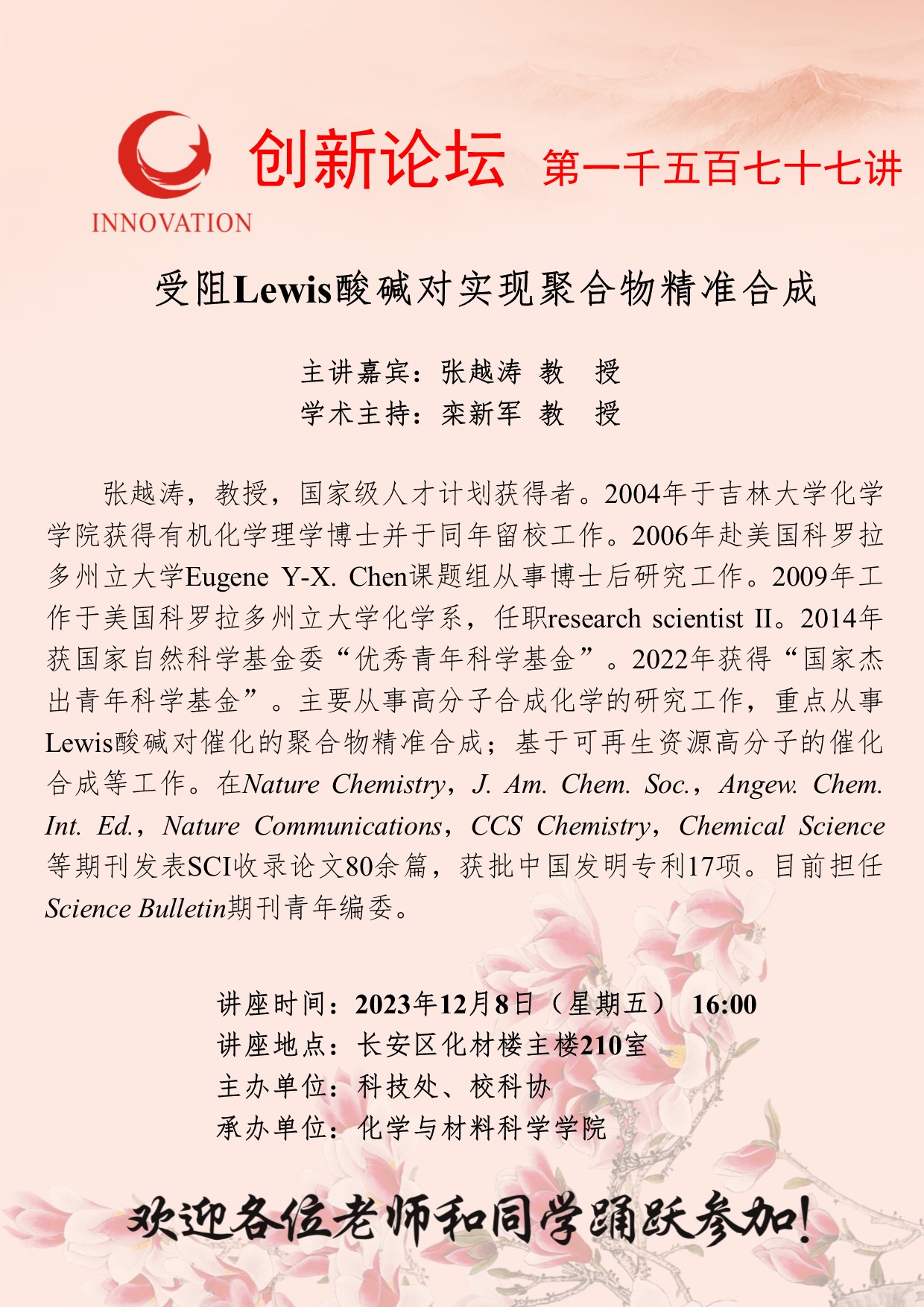 张越涛 教授 广发体育创新论坛第一千五百七十七讲:受阻Lewis酸碱对实现聚合物精准合成 讲座时间 2023年12月8日(星期五) 16:00 讲座地点 长安区化材楼主楼210室 讲座人介绍 张越涛 教授 讲座内容