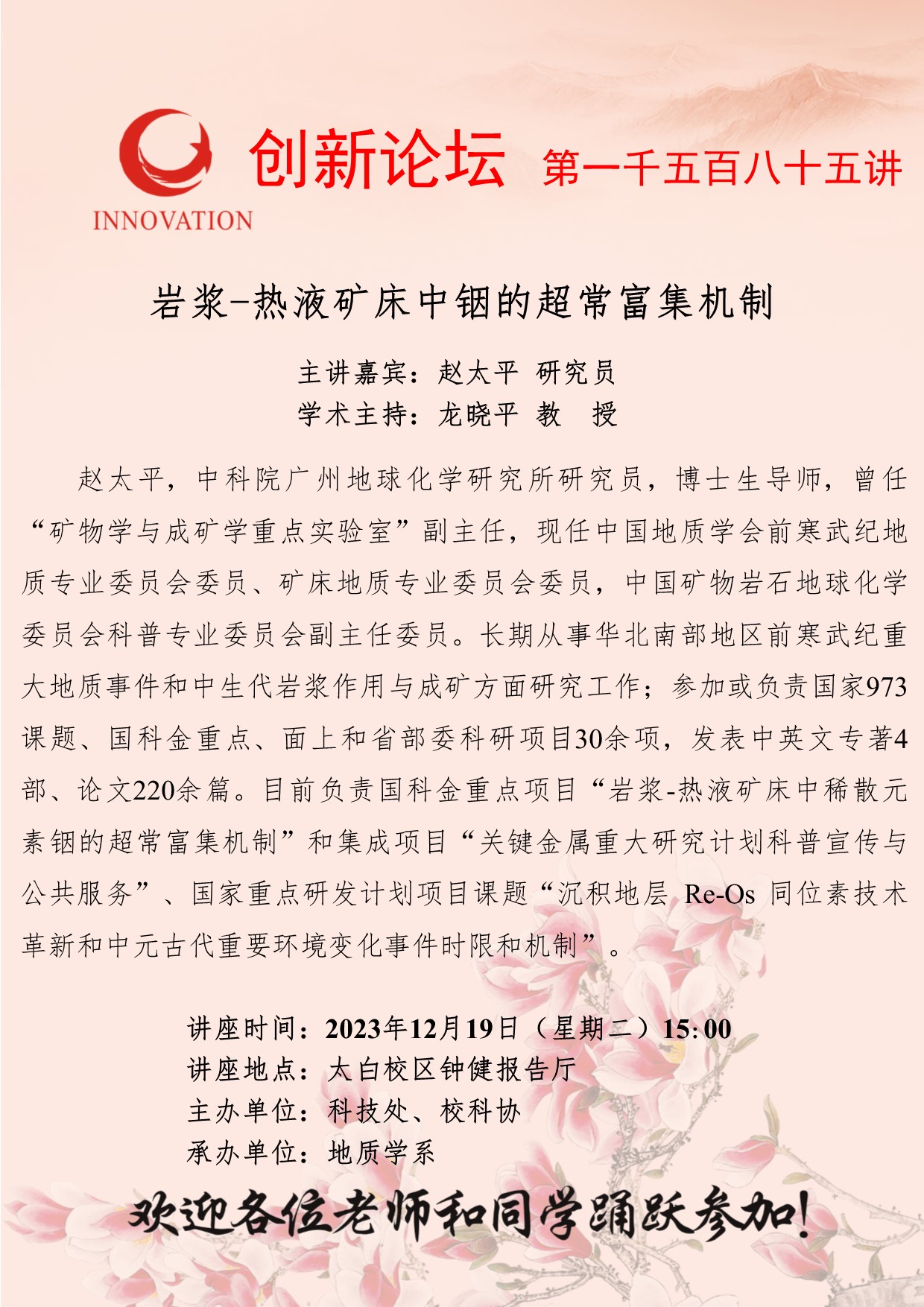 赵太平 研究员 广发体育创新论坛第一千五百八十五讲:岩浆-热液矿床中铟的超常富集机制 讲座时间 2023年12月19日(星期二)15:00 讲座地点 太白校区钟健报告厅 讲座人介绍 赵太平 研究员 讲座内容