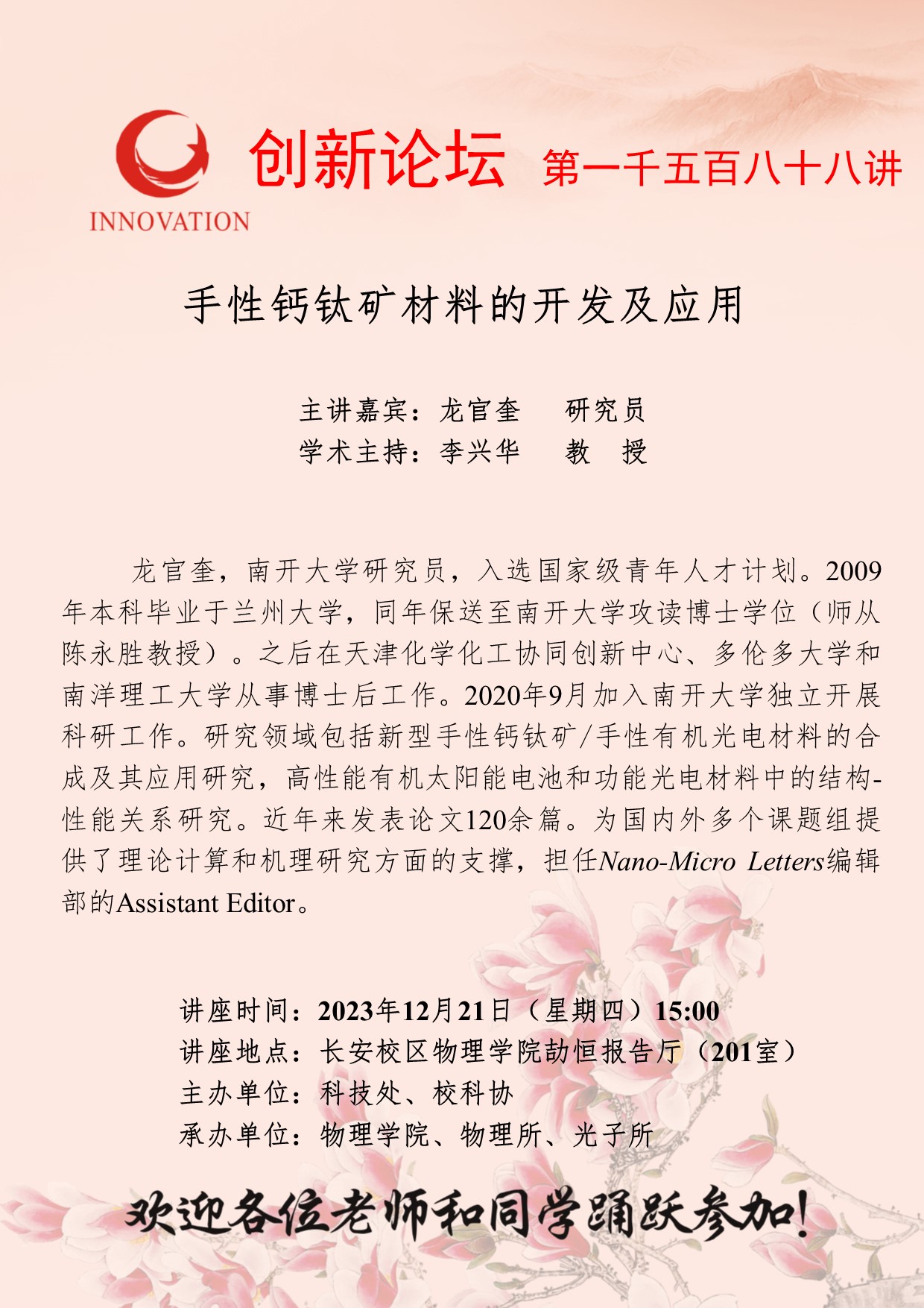 龙官奎 研究员 广发体育创新论坛第一千五百八十八讲:手性钙钛矿材料的开发及应用 讲座时间 2023年12月21日(星期四)15:00 讲座地点 长安校区物理学院劼恒报告厅(201室) 讲座人介绍 龙官奎 研究员 讲座内容