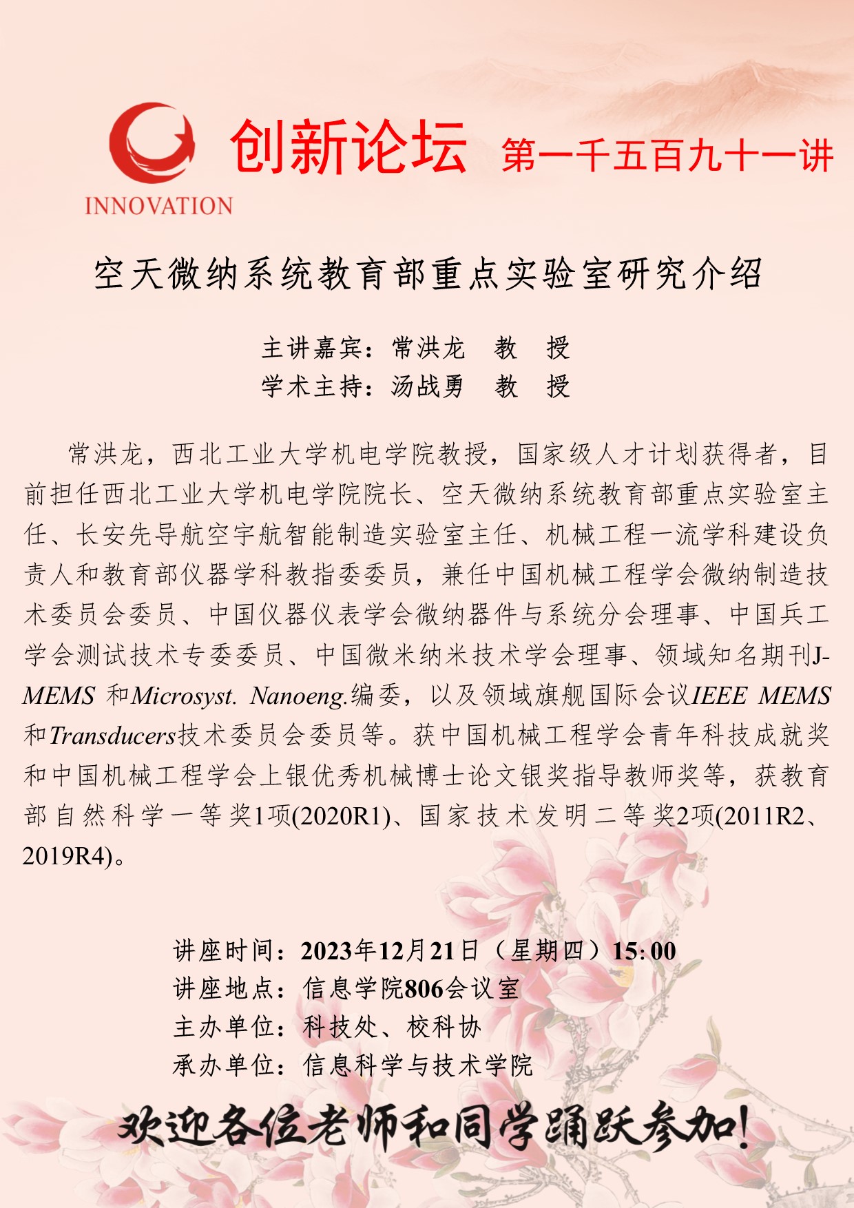 常洪龙 教授 广发体育创新论坛第一千五百九十一讲:空天微纳系统教育部重点实验室研究介绍 讲座时间 2023年12月21日(星期四)15:00 讲座地点 信息学院806会议室 讲座人介绍 常洪龙 教授 讲座内容
