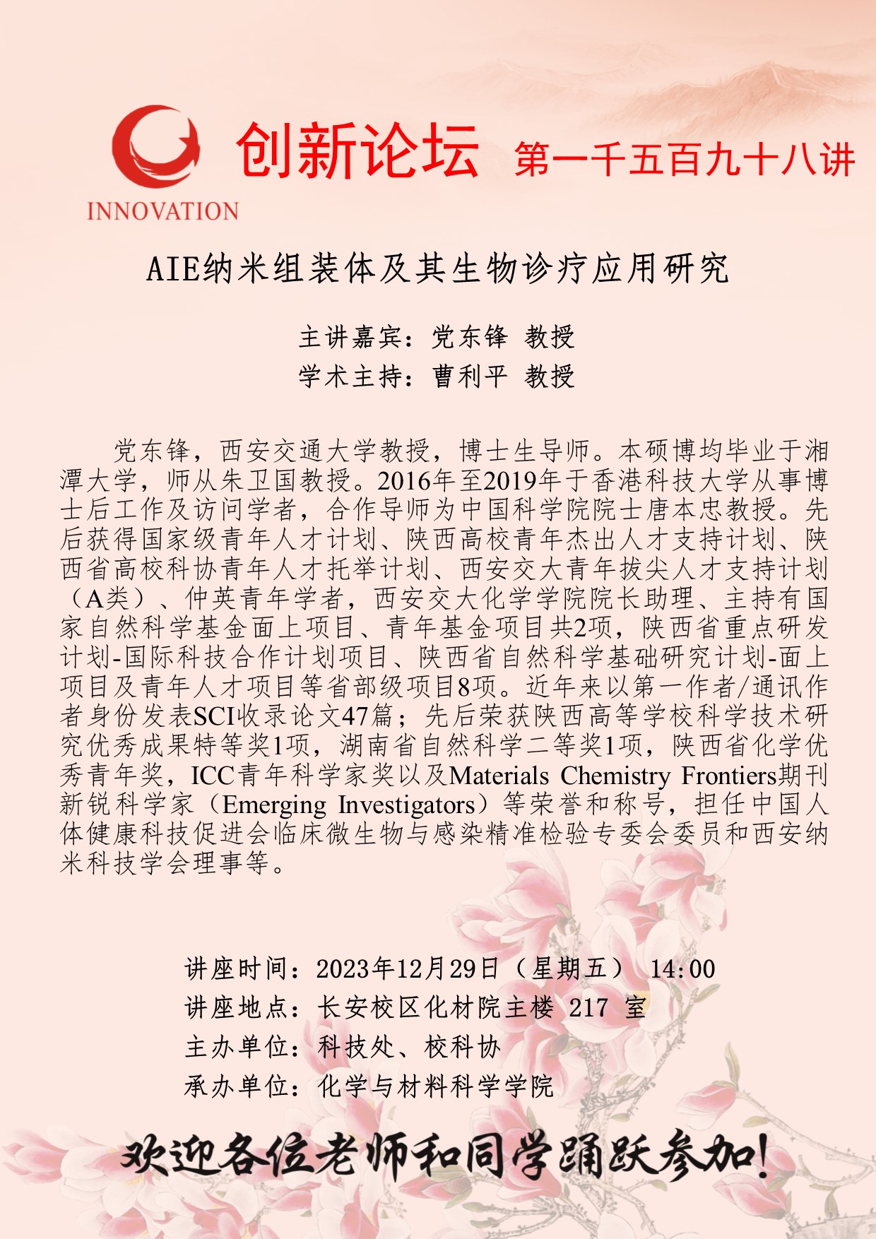 党东锋 教授 广发体育创新论坛第一千五百九十八讲:AIE纳米组装体及其生物诊疗应用研究 讲座时间 2023年12月29日(星期五) 14:00 讲座地点 长安校区化材院主楼217室 讲座人介绍 党东锋 教授 讲座内容