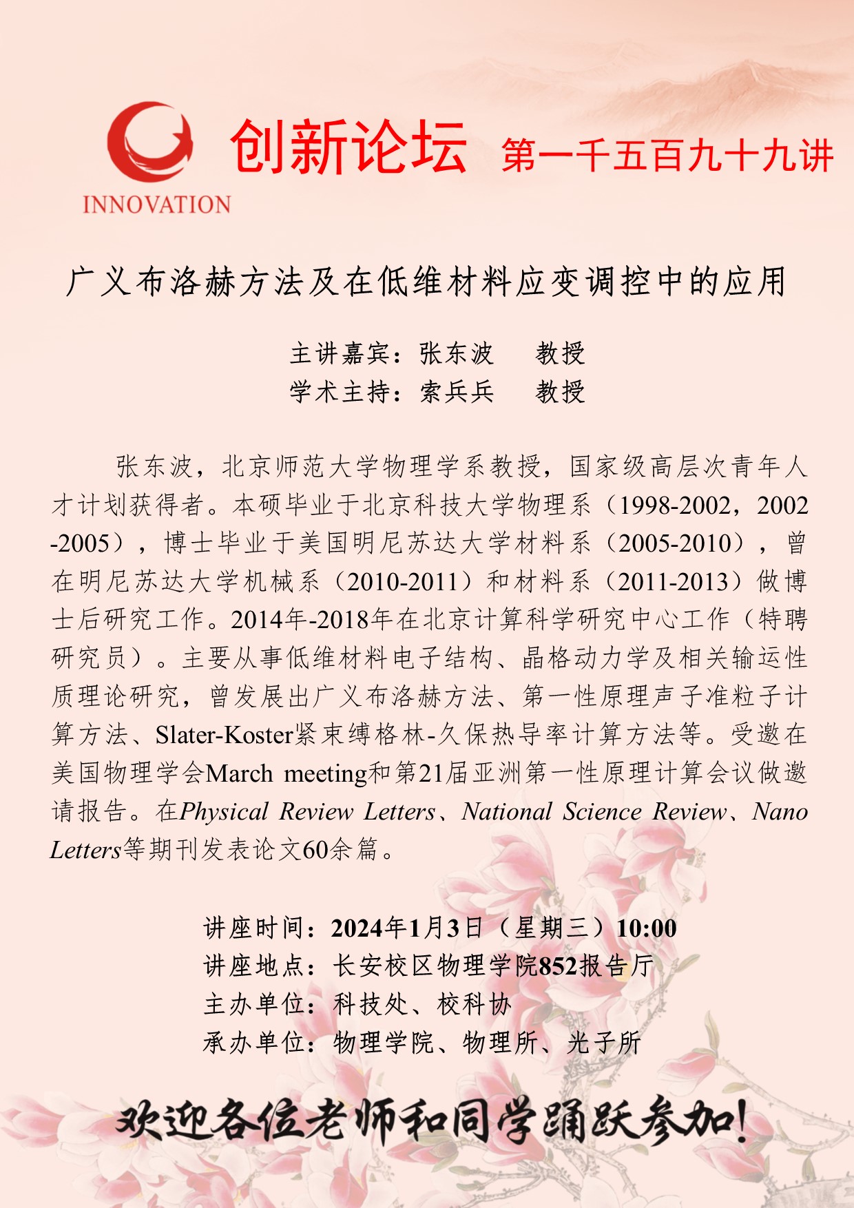 张东波 教授 广发体育创新论坛第一千五百九十九讲:广义布洛赫方法及在低维材料应变调控中的应用 讲座时间 2024年1月3日(星期三)10:00 讲座地点 长安校区物理学院852报告厅 讲座人介绍 张东波 教授 讲座内容
