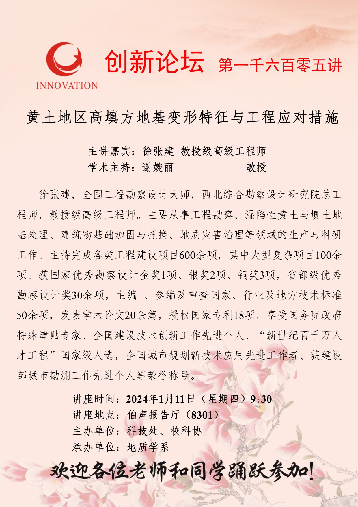 徐张建 教授级高级工程师 广发体育创新论坛第一千六百零五讲:黄土地区高填方地基变形特征与工程应对措施 讲座时间 2024年1月11日(星期四)9:30 讲座地点 伯声报告厅(8301) 讲座人介绍 徐张建 教授级高级工程师 讲座内容