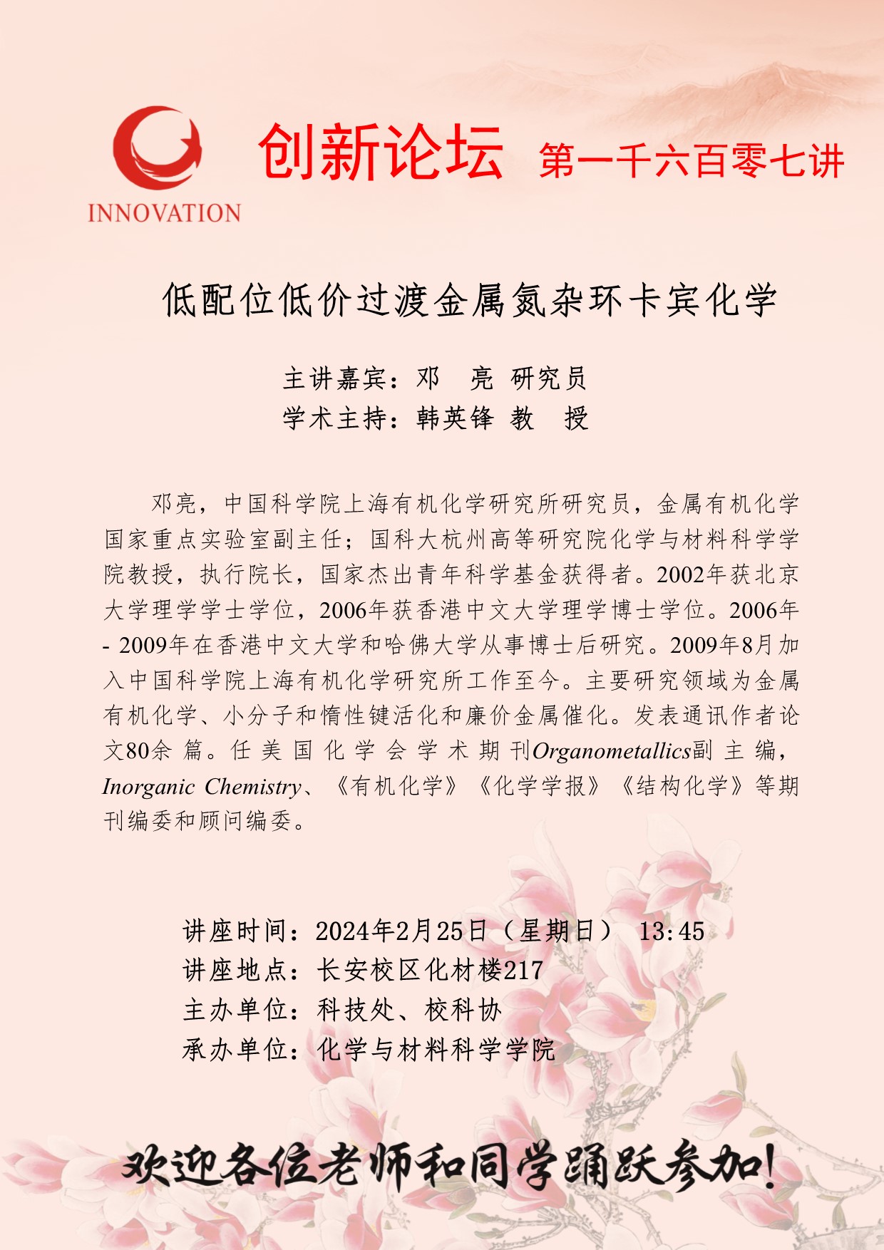 邓亮 研究员 广发体育创新论坛第一千六百零七讲: 低配位低价过渡金属氮杂环卡宾化学 讲座时间 2024年2月25日(星期日) 13:45 讲座地点 长安校区化材楼217 讲座人介绍 邓亮 研究员 讲座内容