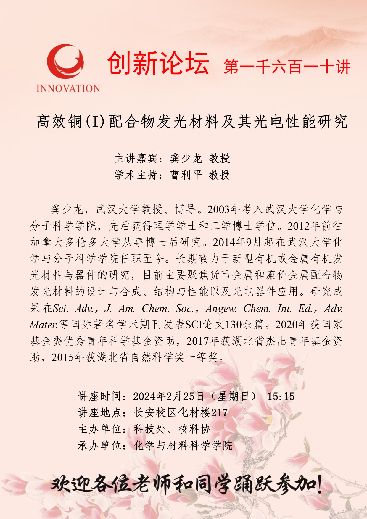龚少龙 教授 广发体育创新论坛第一千六百一十讲:高效铜(I)配合物发光材料及其光电性能研究 讲座时间 2024年2月25日(星期日) 15:15 讲座地点 长安校区化材楼217 讲座人介绍 龚少龙 教授 讲座内容