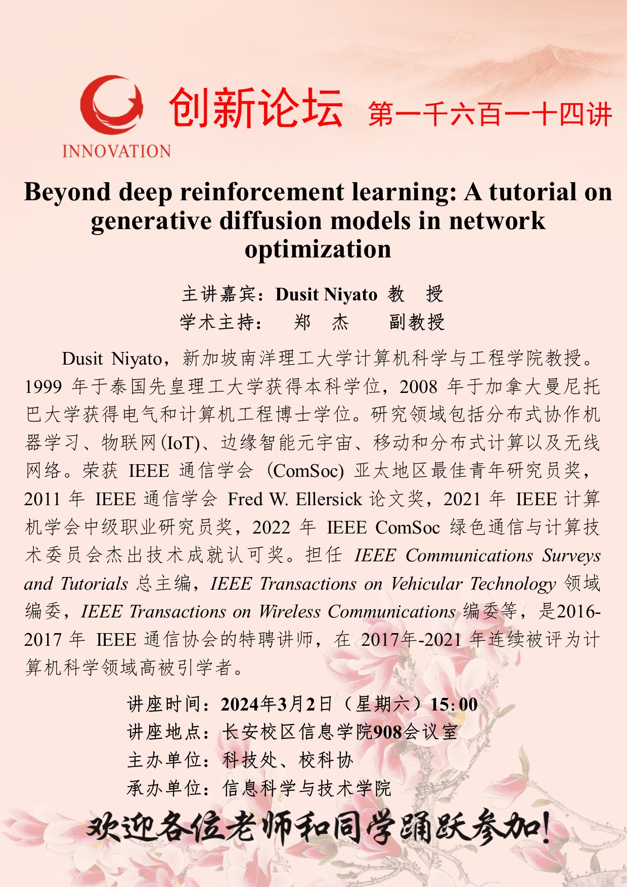 Dusit Niyato 教授 广发体育创新论坛第一千六百一十四讲:Beyond deep reinforcement learning: A tutorial on generative diffusion models in network optimization 讲座时间 2024年3月2日(星期六)15:00 讲座地点 长安校区信息学院908会议室 讲座人介绍 Dusit Niyato 教授 讲座内容