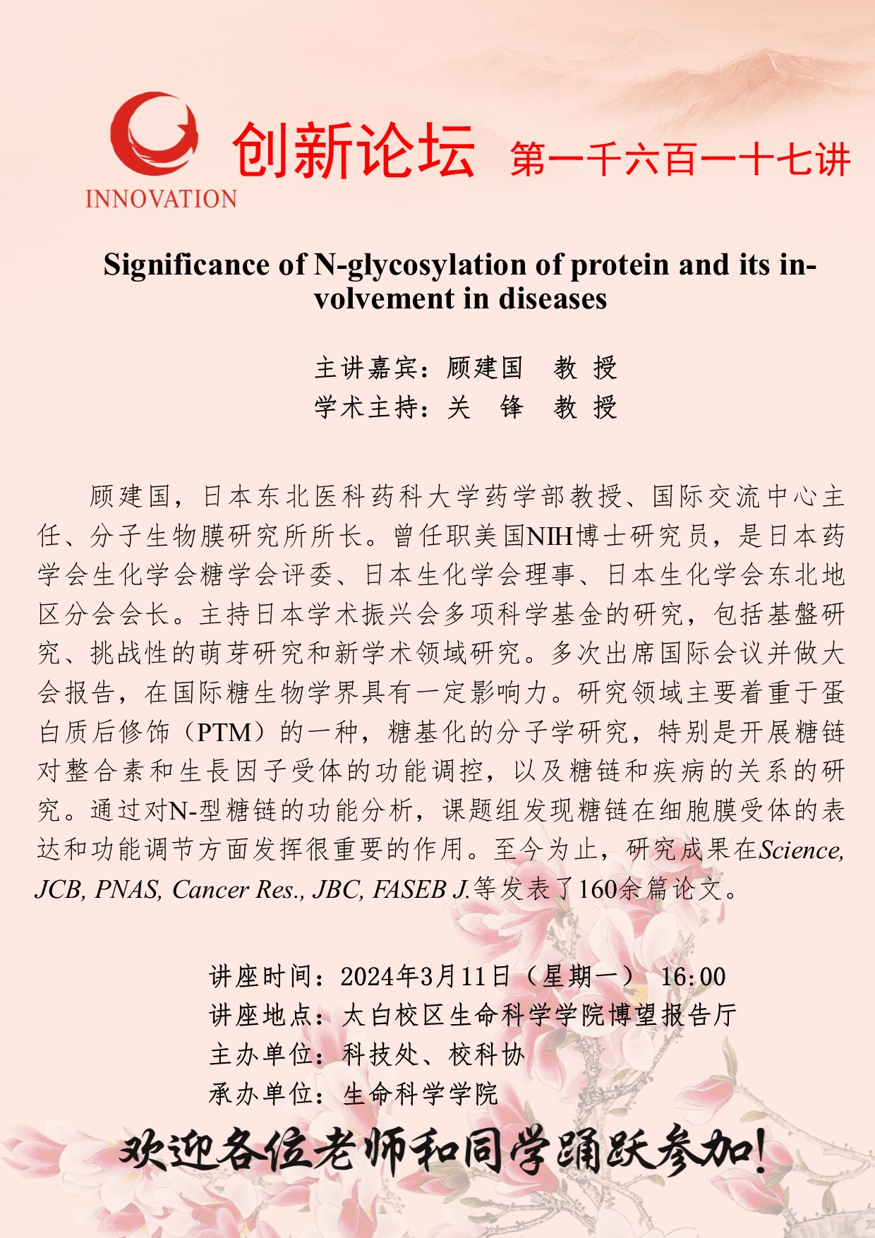 顾建国 教授 广发体育创新论坛第一千六百一十七讲:Significance of N-glycosylation of protein and its involvement in diseases 讲座时间 2024年3月11日(星期一) 16:00 讲座地点 太白校区生命科学学院博望报告厅 讲座人介绍 顾建国 教授 讲座内容