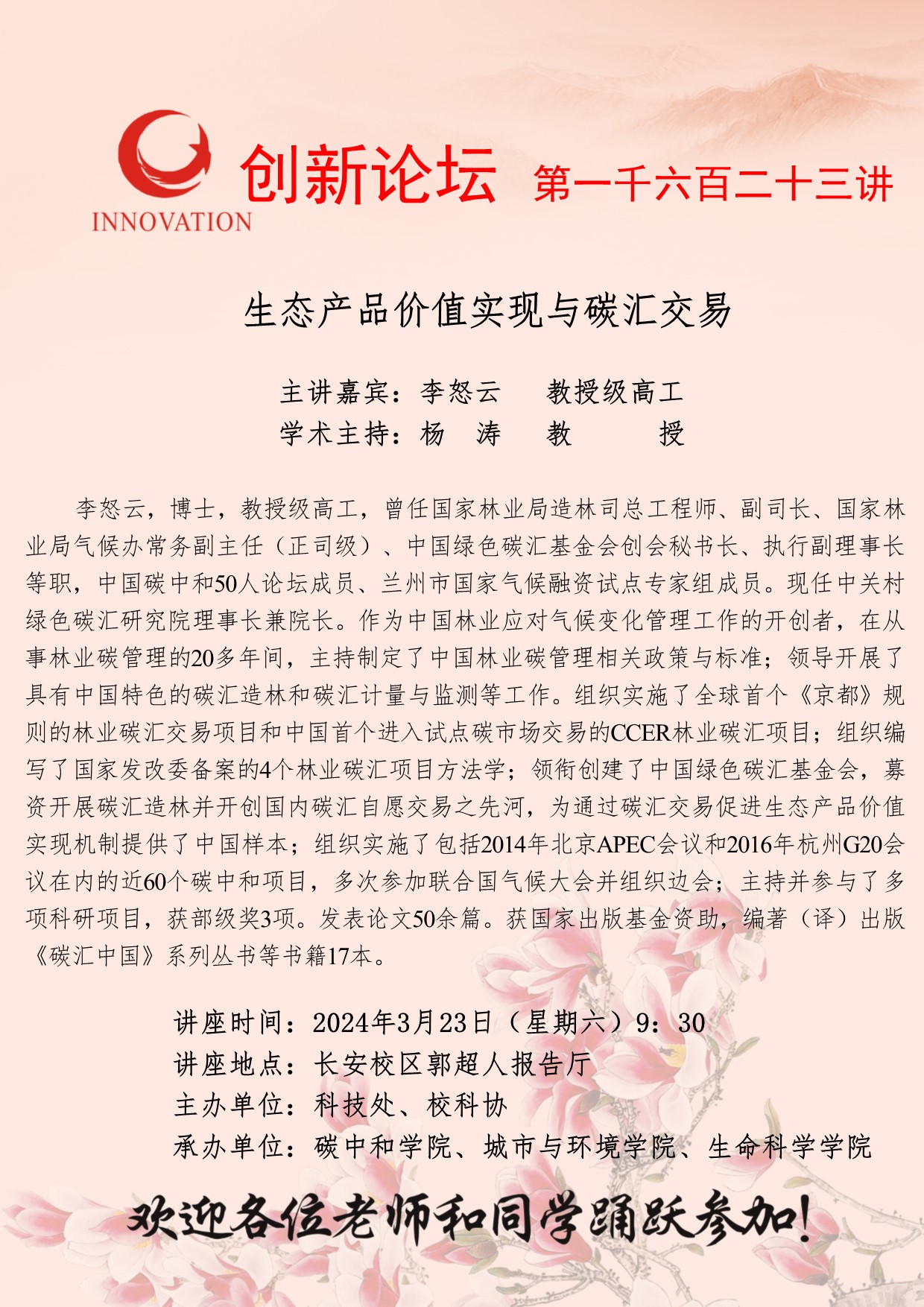 李怒云 教授级高工 广发体育创新论坛第一千六百二十三讲:生态产品价值实现与碳汇交易 讲座时间 2024年3月23日(星期六)9:30 讲座地点 长安校区郭超人报告厅 讲座人介绍 李怒云 教授级高工 讲座内容