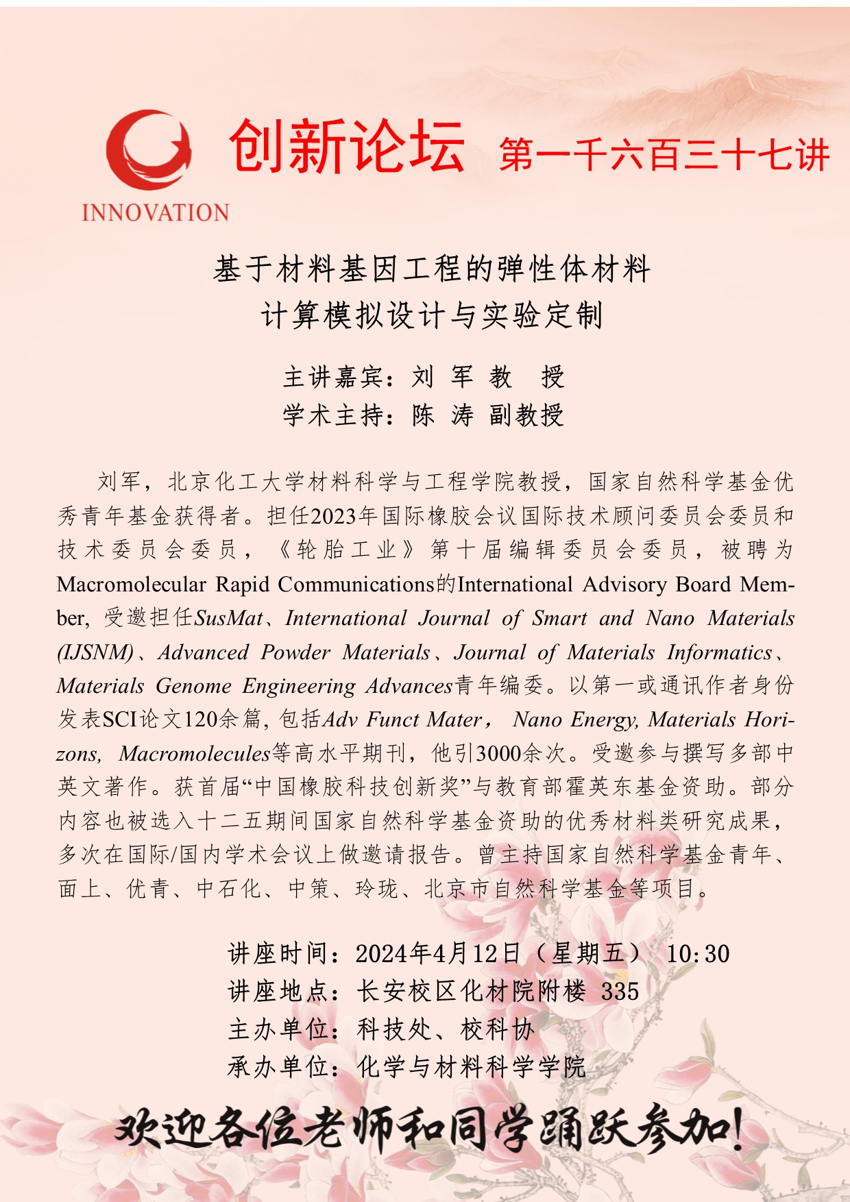 刘军 教授 广发体育创新论坛第一千六百三十七讲:基于材料基因工程的弹性体材料计算模拟设计与实验定制 讲座时间 2024年4月12日(星期五) 10:30 讲座地点 长安校区化材院附楼335 讲座人介绍 刘军 教授 讲座内容