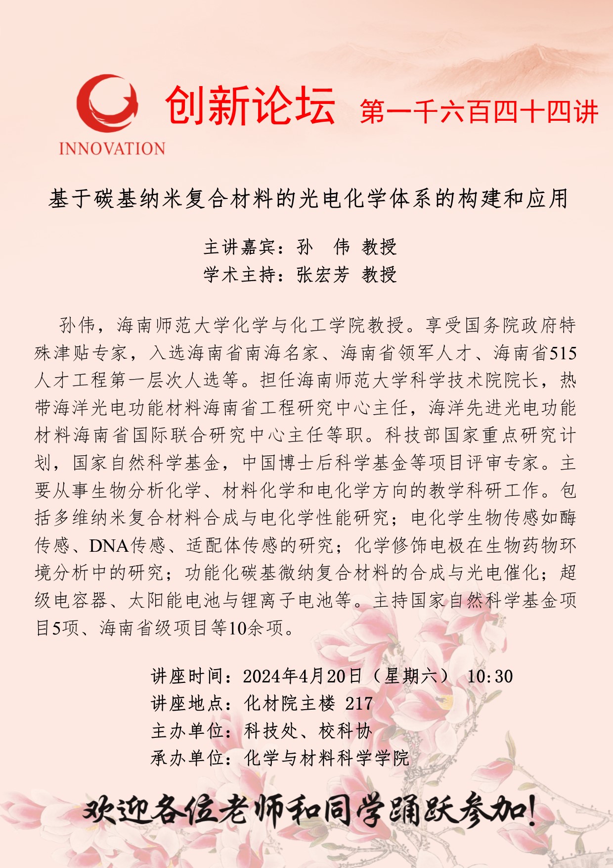 孙伟 教授 广发体育创新论坛第一千六百四十四讲:基于碳基纳米复合材料的光电化学体系的构建和应用 讲座时间 2024年4月20日(星期六) 10:30 讲座地点 化材院主楼 217 讲座人介绍 孙伟 教授 讲座内容