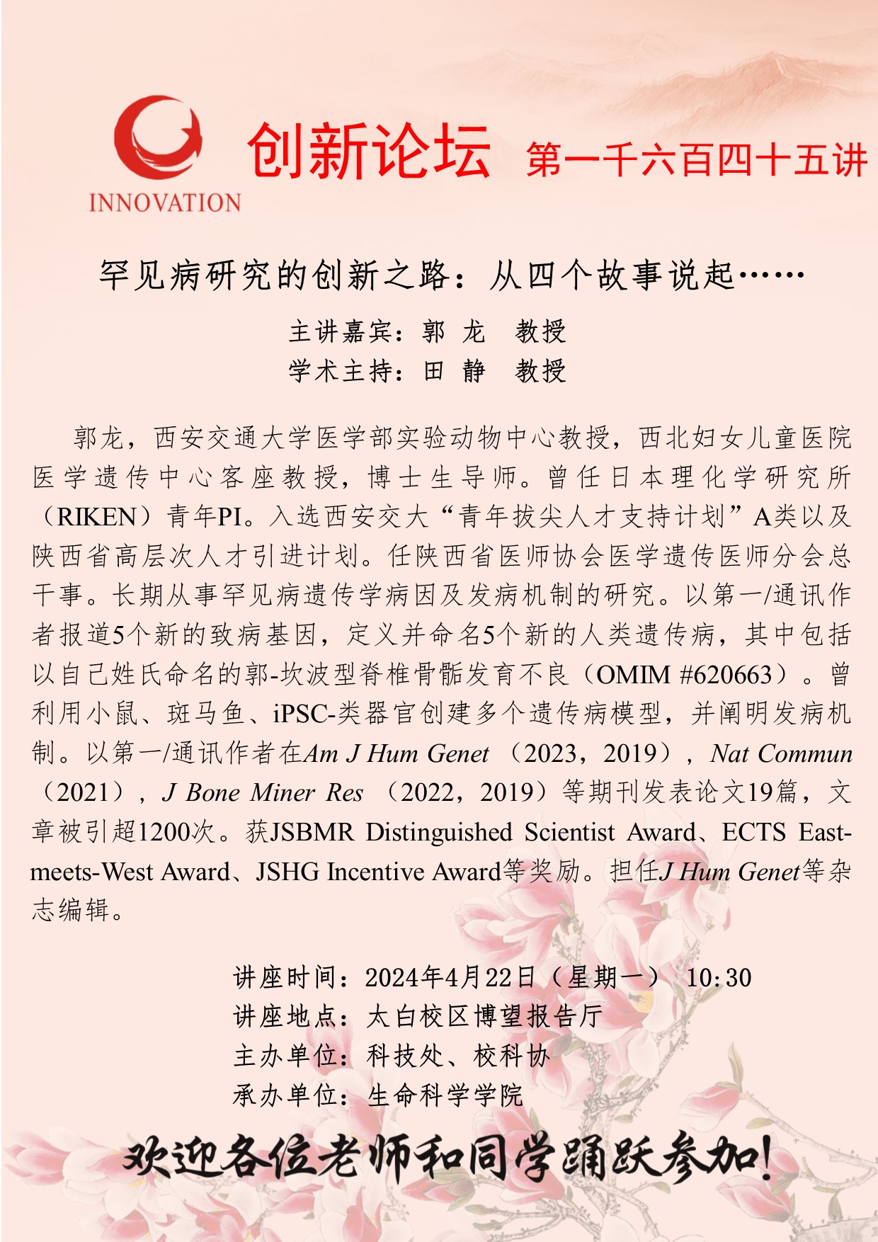郭龙 教授 广发体育创新论坛第一千六百四十五讲:罕见病研究的创新之路:从四个故事说起…… 讲座时间 2024年4月22日(星期一) 10:30 讲座地点 太白校区博望报告厅 讲座人介绍 郭龙 教授 讲座内容