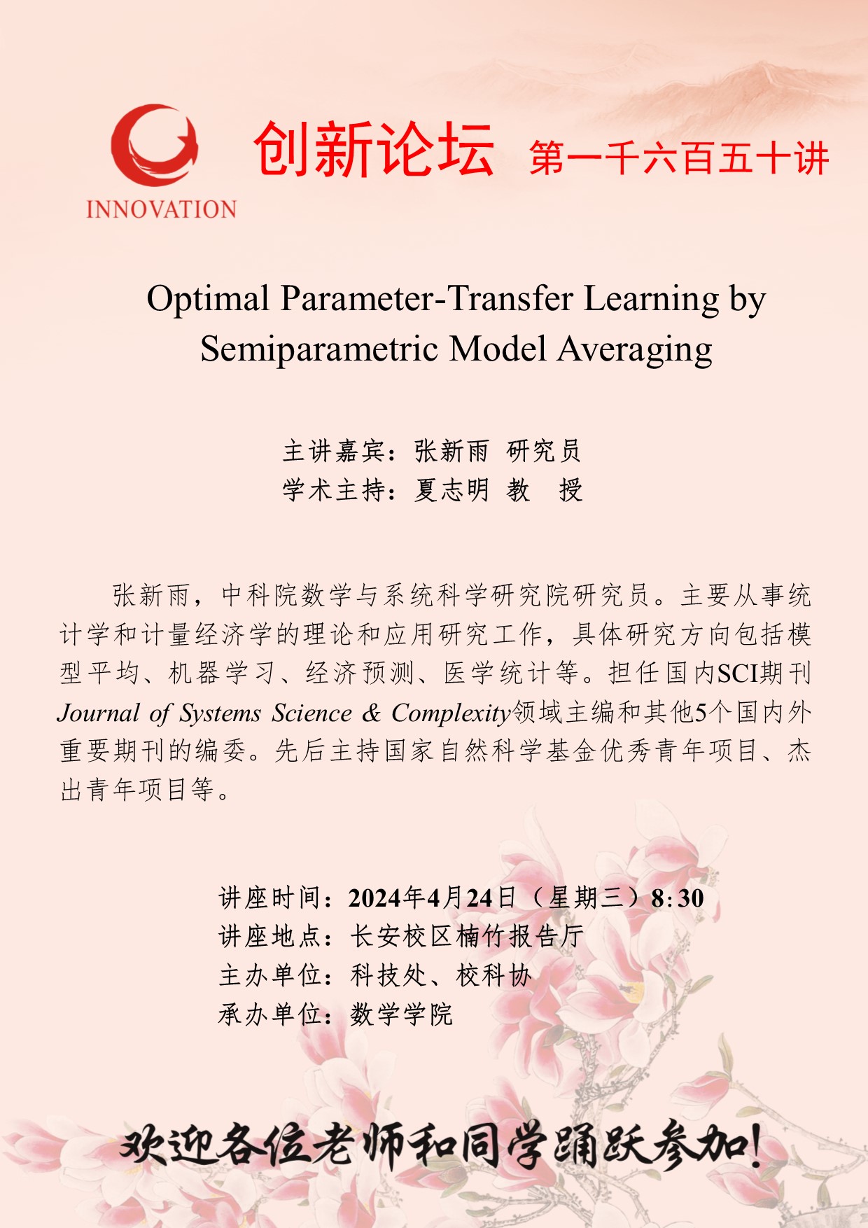 张新雨 研究员 广发体育创新论坛第一千六百五十讲:Optimal Parameter-Transfer Learning by Semiparametric Model Averaging 讲座时间 2024年4月24日(星期三)8:30 讲座地点 长安校区楠竹报告厅 讲座人介绍 张新雨 研究员 讲座内容