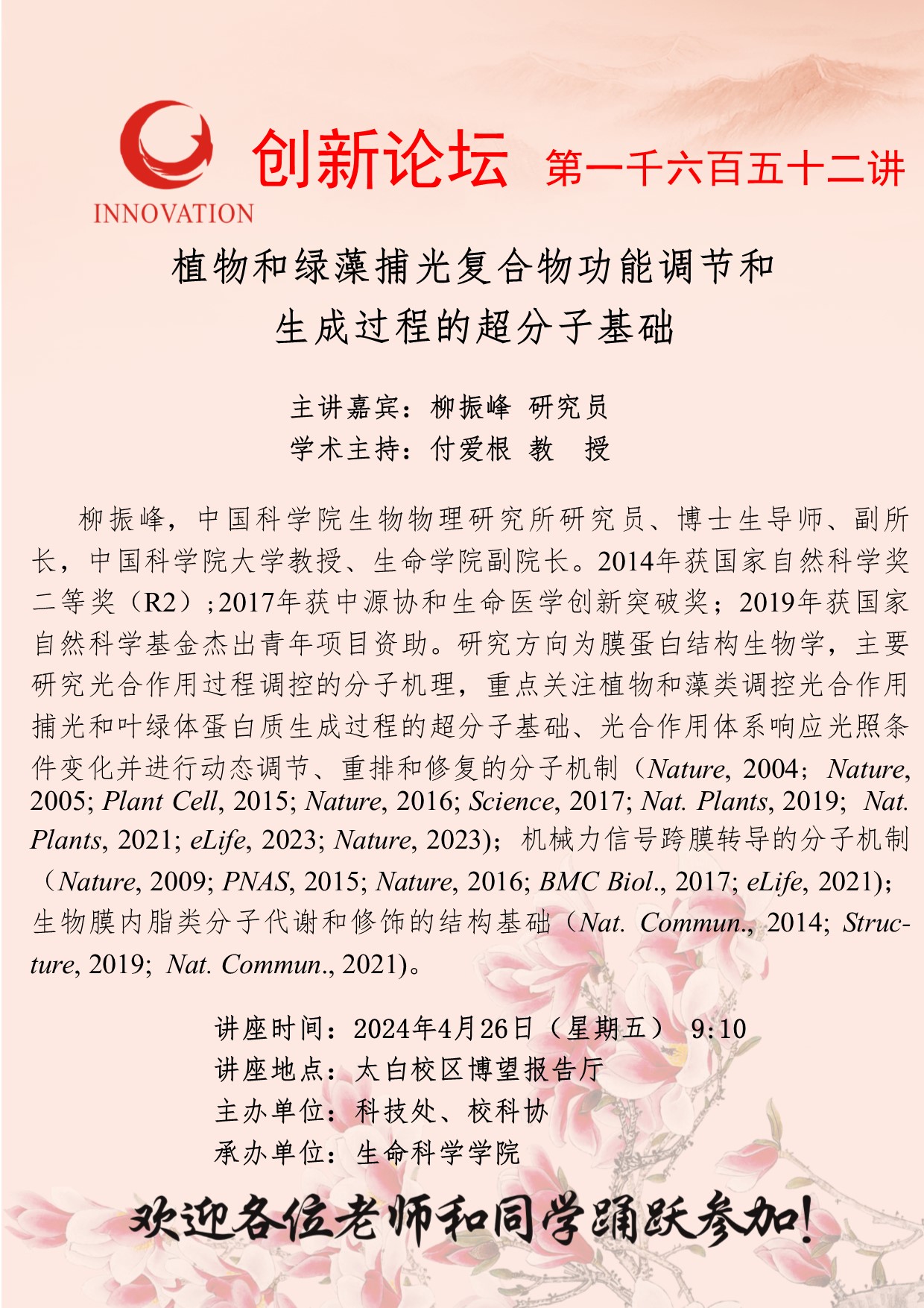 柳振峰 研究员 广发体育创新论坛第一千六百五十二讲:植物和绿藻捕光复合物功能调节和生成过程的超分子基础 讲座时间 2024年4月26日(星期五) 9:10 讲座地点 太白校区博望报告厅 讲座人介绍 柳振峰 研究员 讲座内容