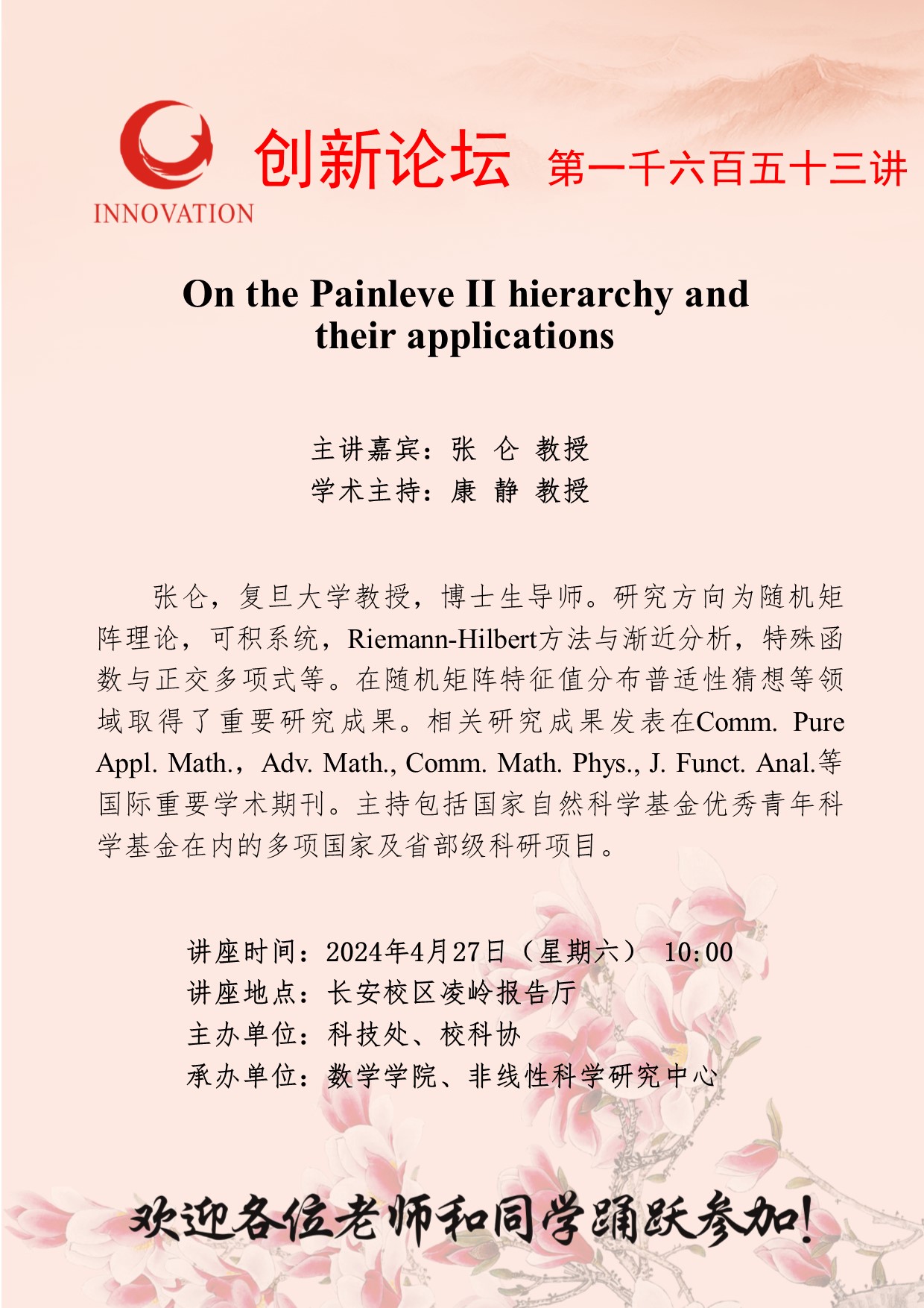 张仑 教授 广发体育创新论坛第一千六百五十三讲:On the Painleve II hierarchy and their applications 讲座时间 2024年4月27日(星期六) 10:00 讲座地点 长安校区凌岭报告厅 讲座人介绍 张仑 教授 讲座内容