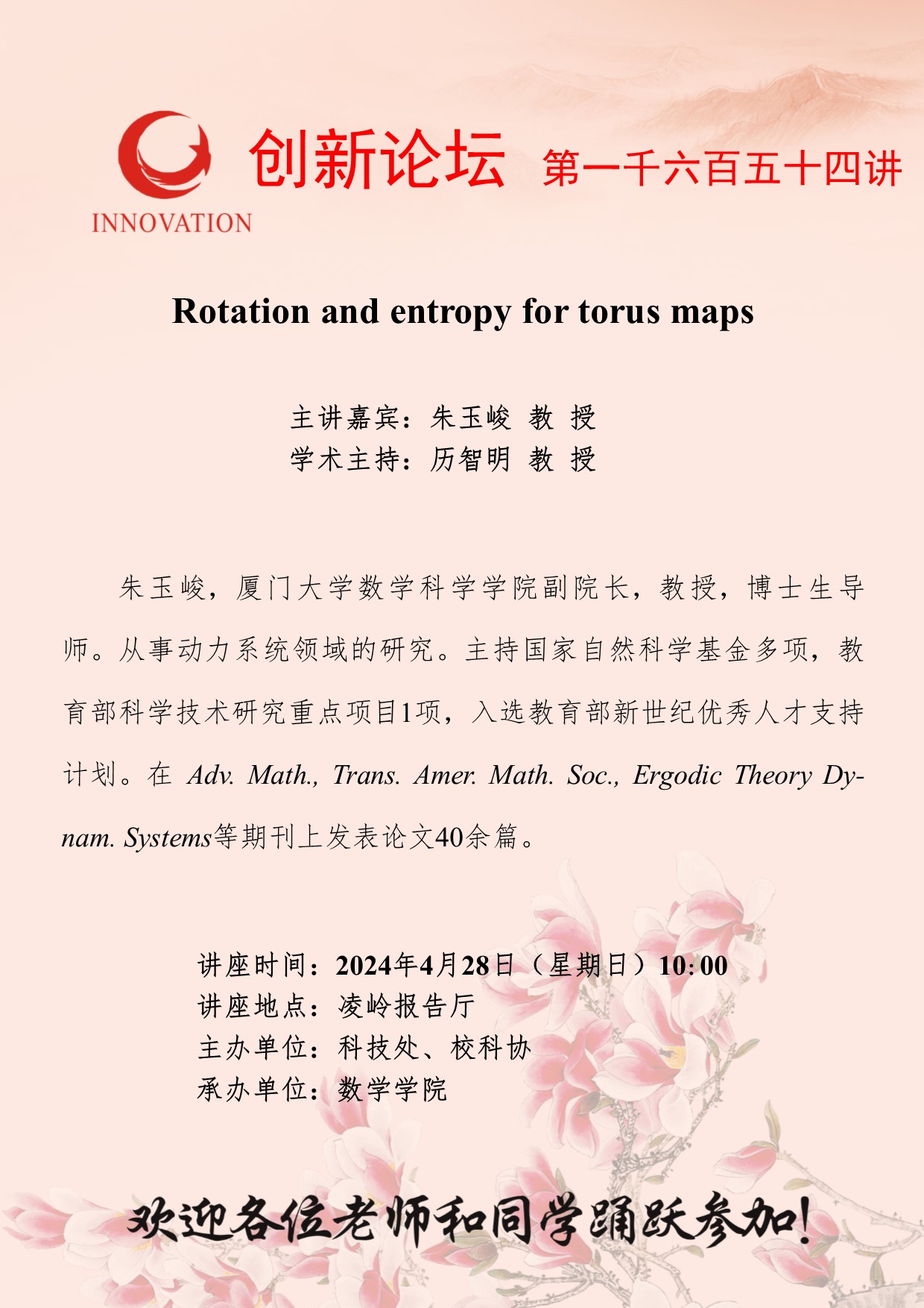 朱玉峻 教授 广发体育创新论坛第一千六百五十四讲:Rotation and entropy for torus maps 讲座时间 2024年4月28日(星期日)10:00 讲座地点 凌岭报告厅 讲座人介绍 朱玉峻 教授 讲座内容