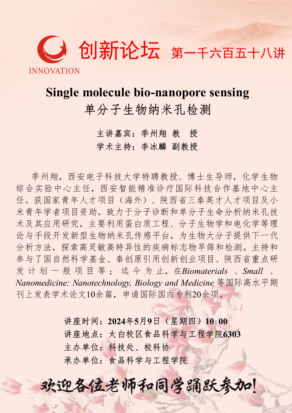季州翔 教授 广发体育创新论坛第一千六百五十八讲:Single molecule bio-nanopore sensing 讲座时间 2024年5月9日(星期四)10:00 讲座地点 太白校区食品科学与工程学院6303 讲座人介绍 季州翔 教授 讲座内容