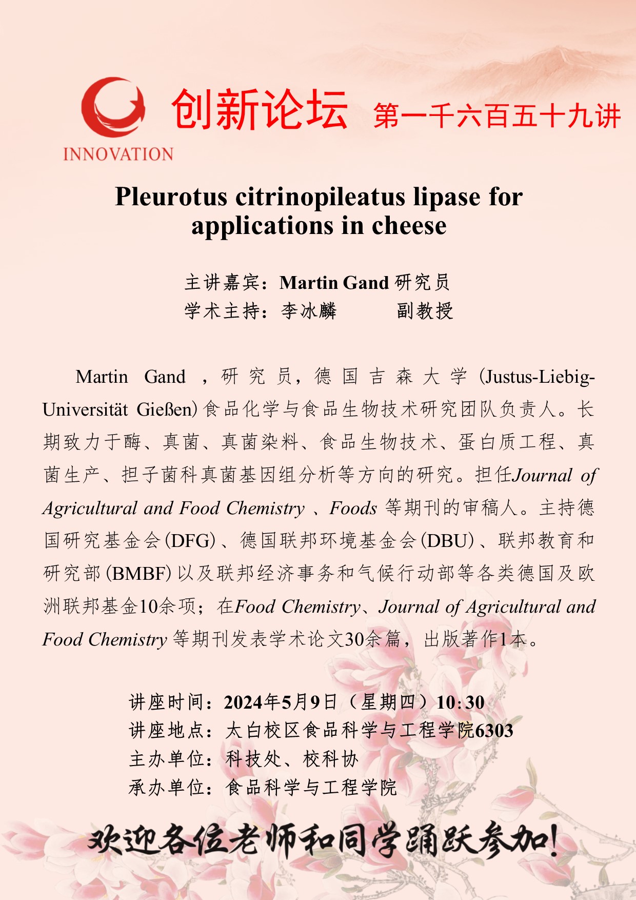 Martin Gand 研究员 广发体育创新论坛第一千六百五十九讲:Pleurotus citrinopileatus lipase for applications in cheese 讲座时间 2024年5月9日(星期四)10:30 讲座地点 太白校区食品科学与工程学院6303 讲座人介绍 Martin Gand 研究员 讲座内容