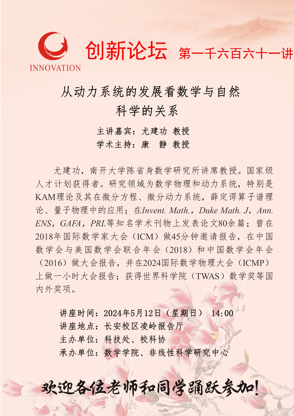 尤建功 教授 广发体育创新论坛第一千六百六十一讲:从动力系统的发展看数学与自然科学的关系 讲座时间 2024年5月12日(星期日) 14:00 讲座地点 长安校区凌岭报告厅 讲座人介绍 尤建功 教授 讲座内容