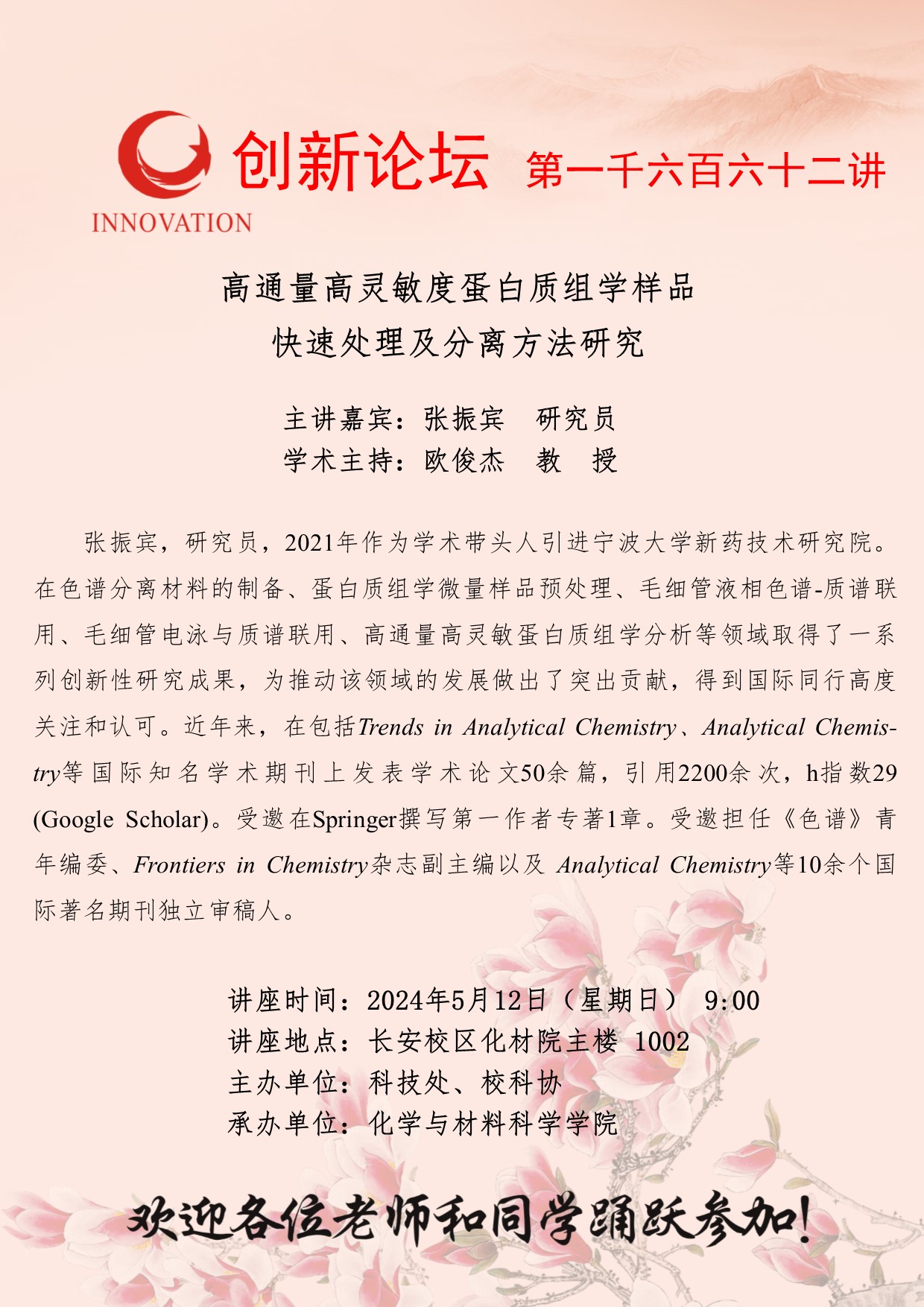 张振宾 研究员 广发体育创新论坛第一千六百六十二讲:高通量高灵敏度蛋白质组学样品快速处理及分离方法研究 讲座时间 2024年5月12日(星期日) 9:00 讲座地点 长安校区化材院主楼 讲座人介绍 张振宾 研究员 讲座内容