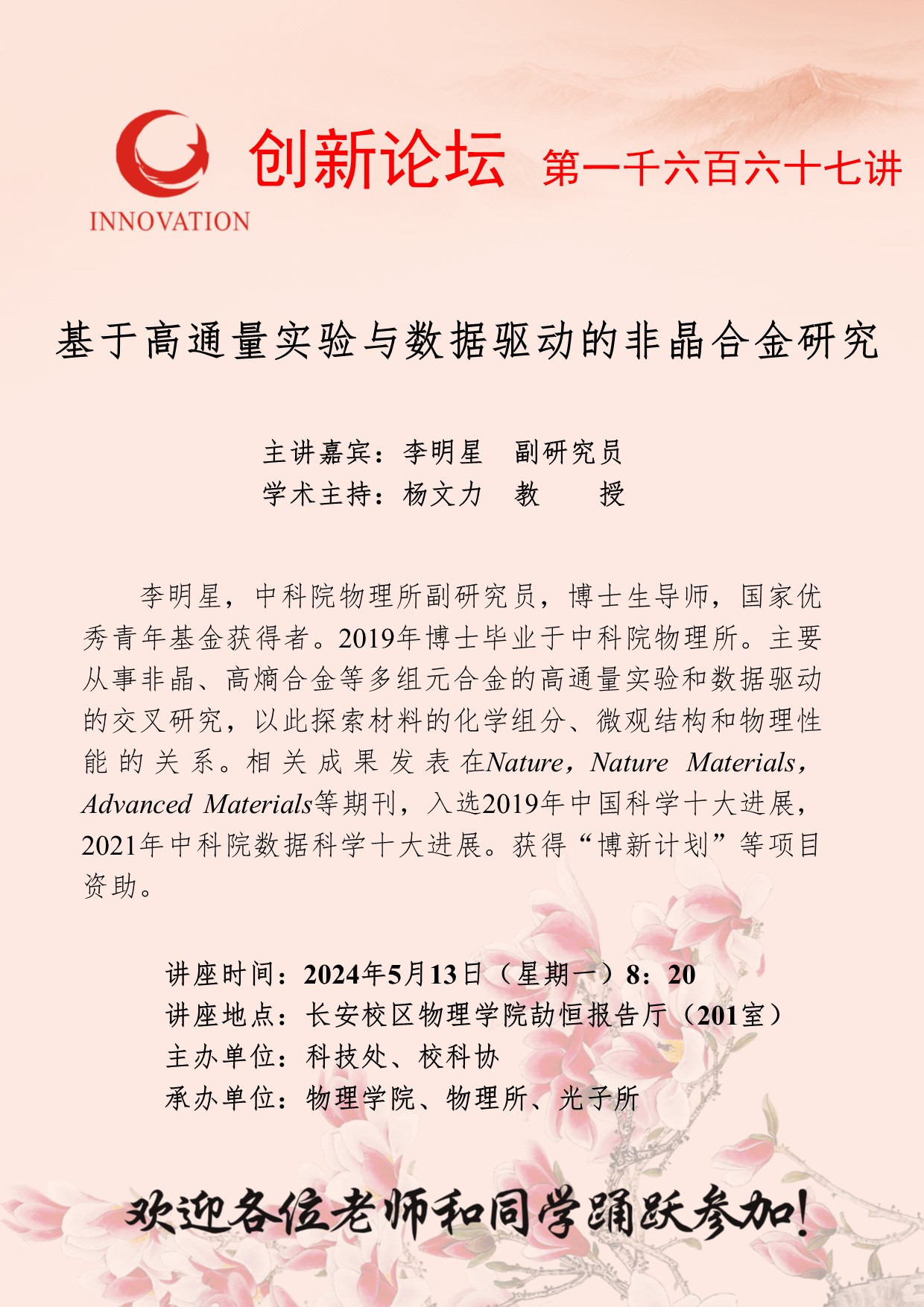 李明星 副研究员 广发体育创新论坛第一千六百六十七讲:基于高通量实验与数据驱动的非晶合金研究 讲座时间 2024年5月13日(星期一)8:20 讲座地点 长安校区物理学院劼恒报告厅(201室) 讲座人介绍 李明星 副研究员 讲座内容
