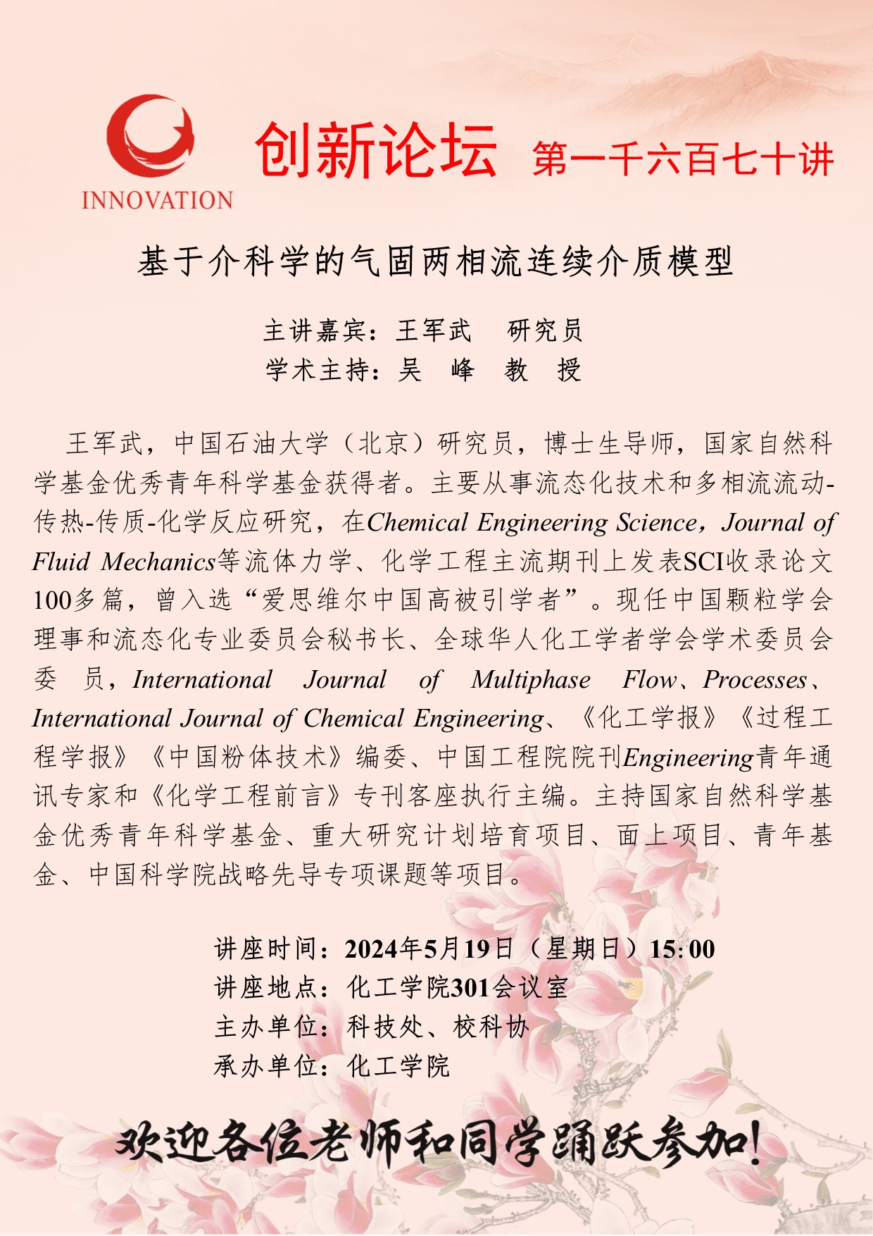 王军武 研究员 广发体育创新论坛第一千六百七十讲:基于介科学的气固两相流连续介质模型 讲座时间 2024年5月19日(星期日)15:00 讲座地点 化工学院301会议室 讲座人介绍 王军武 研究员 讲座内容