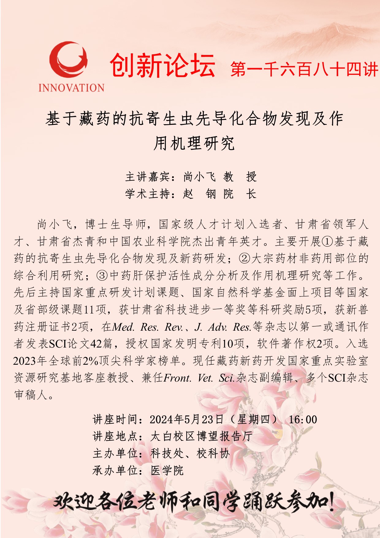 尚小飞 教授 广发体育创新论坛第一千六百八十四讲:基于藏药的抗寄生虫先导化合物发现及作用机理研究 讲座时间 2024年5月23日(星期四) 16:00 讲座地点 太白校区博望报告厅 讲座人介绍 尚小飞 教授 讲座内容
