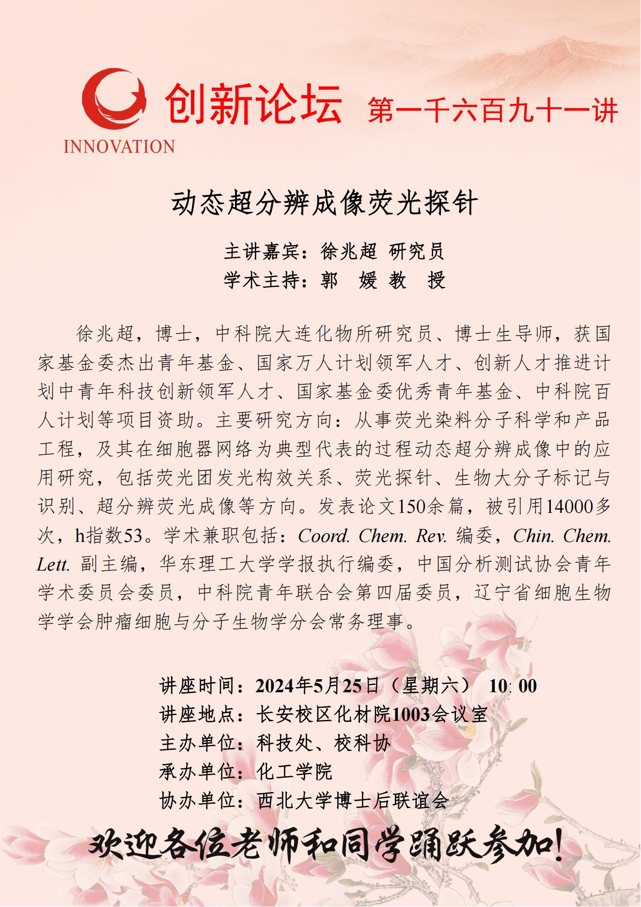 徐兆超 研究员 广发体育创新论坛第一千六百九十一讲:动态超分辨成像荧光探针 讲座时间 2024年5月25日(星期六) 10: 00 讲座地点 长安校区化材院1003会议室 讲座人介绍 徐兆超 研究员 讲座内容