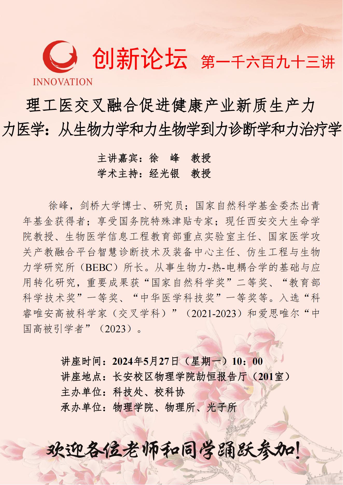 徐峰 教授 广发体育创新论坛第一千六百九十三讲:理工医交叉融合促进健康产业新质生产力——力医学:从生物力学和力生物学到力诊断学和力治疗学 讲座时间 2024年5月27日(星期一)10:00 讲座地点 长安校区物理学院劼恒报告厅(201室) 讲座人介绍 徐峰 教授 讲座内容