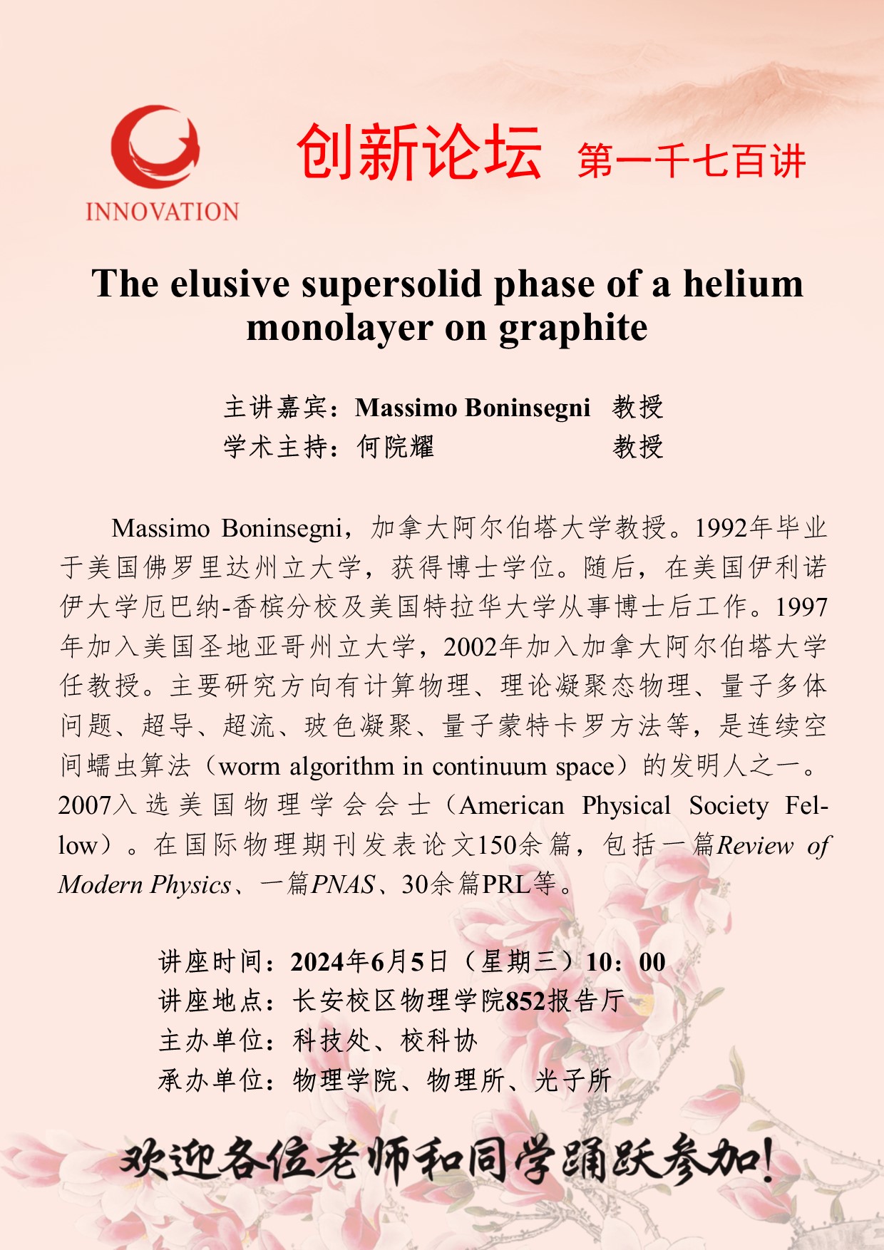 Massimo Boninsegni 教授 广发体育创新论坛第一千七百讲:The elusive supersolid phase of a helium monolayer on graphite 讲座时间 2024年6月5日(星期三)10:00 讲座地点 长安校区物理学院852报告厅 讲座人介绍 Massimo Boninsegni 教授 讲座内容