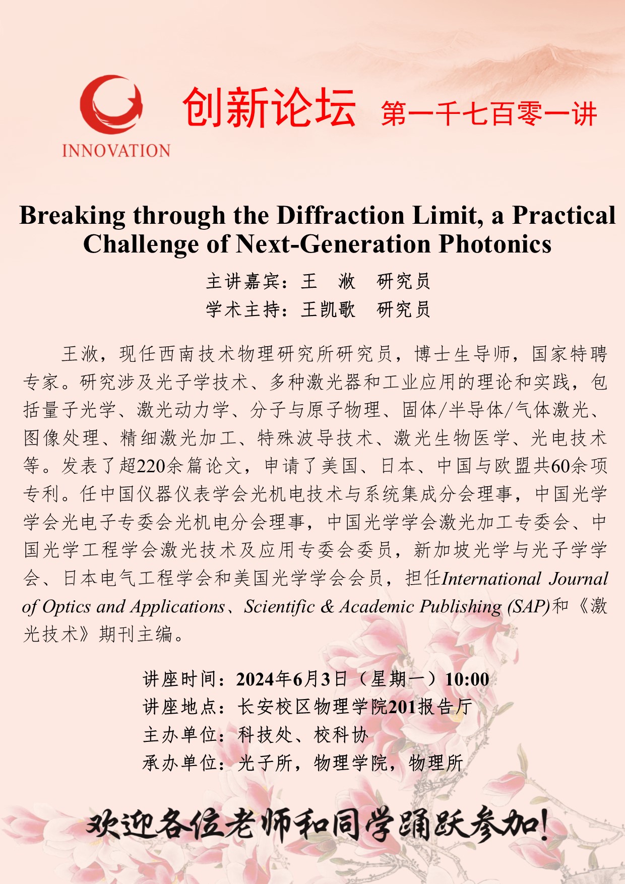 王浟 研究员 广发体育创新论坛第一千七百零一讲:Breaking through the Diffraction Limit, a Practical Challenge of Next-Generation Photonics 讲座时间 2024年6月3日(星期一)10:00 讲座地点 长安校区物理学院201报告厅 讲座人介绍 王浟 研究员 讲座内容