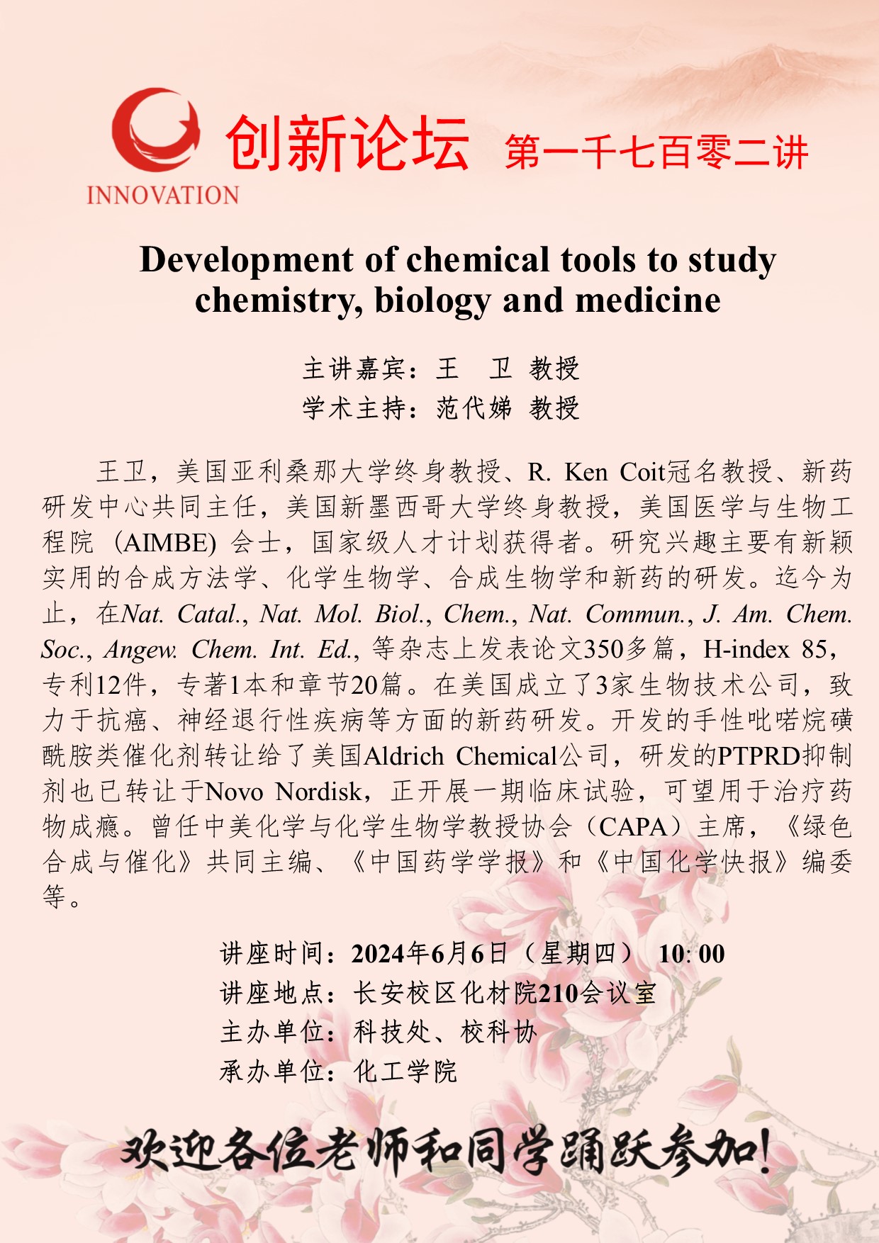 王卫 教授 广发体育创新论坛第一千七百零二讲:Development of chemical tools to study chemistry, biology and medicine 讲座时间 2024年6月6日(星期四) 10: 00 讲座地点 长安校区化材院210会议室 讲座人介绍 王卫 教授 讲座内容