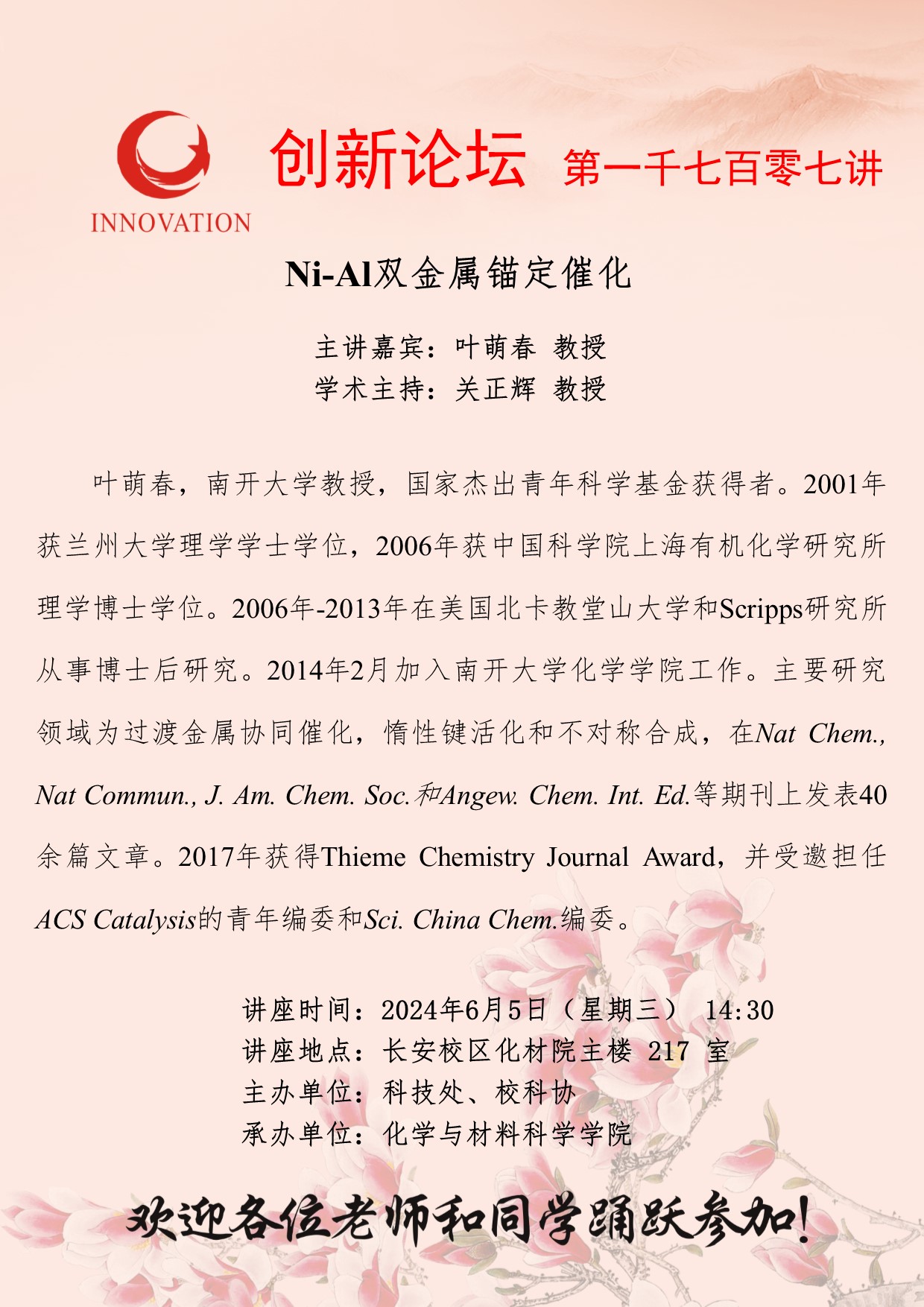 叶萌春 教授 广发体育创新论坛第一千七百零七讲:Ni-Al双金属锚定催化 讲座时间 2024年6月5日(星期三) 14:30 讲座地点 长安校区化材院主楼 217 室 讲座人介绍 叶萌春 教授 讲座内容