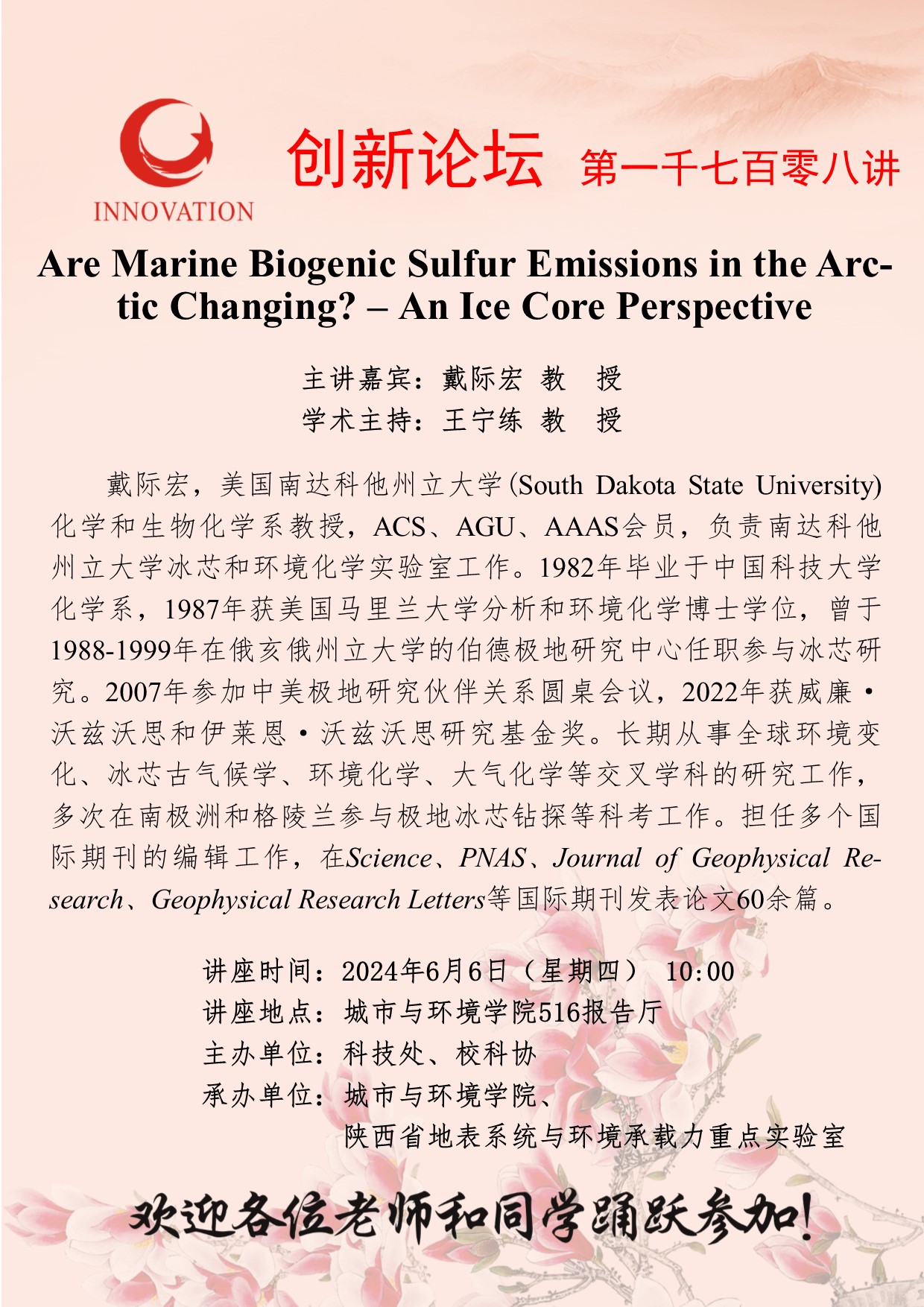 戴际宏 教授 广发体育创新论坛第一千七百零八讲:Are Marine Biogenic Sulfur Emissions in the Arctic Changing? – An Ice Core Perspective 讲座时间 2024年6月6日(星期四) 10:00 讲座地点 城市与环境学院516报告厅 讲座人介绍 戴际宏 教授 讲座内容
