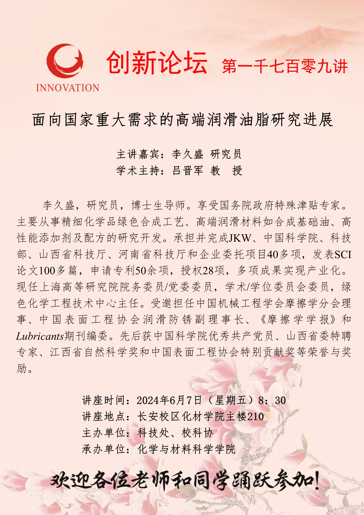 李久盛 研究员 广发体育创新论坛第一千七百零九讲:面向国家重大需求的高端润滑油脂研究进展 讲座时间 2024年6月7日(星期五)8:30 讲座地点 长安校区化材学院主楼210 讲座人介绍 李久盛 研究员 讲座内容