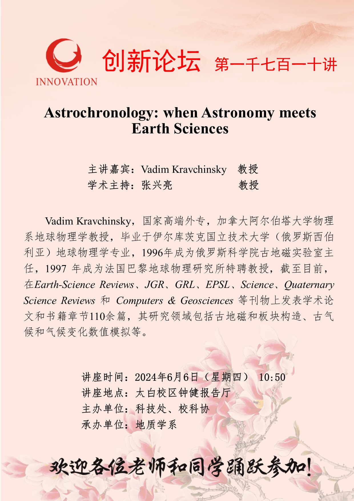 Vadim Kravchinsky 教授 广发体育创新论坛第一千七百一十讲:Astrochronology: when Astronomy meets Earth Sciences 讲座时间 2024年6月6日(星期四) 10:50 讲座地点 太白校区钟健报告厅 讲座人介绍 Vadim Kravchinsky 教授 讲座内容